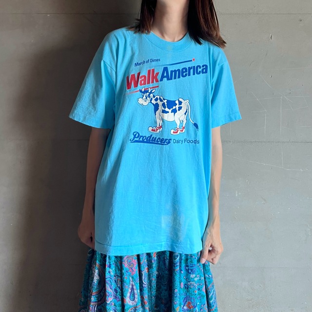 スニーカーを履いた牛のプリントTシャツ。 爽やかなスカイブルーカラーのボディは大きすぎず小さすぎずのグッドサイズです。 【着用スタッフ身長】 161cm 【平置き実寸(cm)】 着丈 / 65 肩幅 / 51 身幅 / 54 袖丈 / 21 素材:コットン、ポリエステル ダメージ:シミあります(写真をご確認ください) ――――――――――――――――――――――――――――――――― 〇ご購入前にお読みください〇 ●梱包資材については簡易包装とさせていただいておりますので内袋に入れずに発送しております。 ●当店の商品は全てUSED商品のため、記載がなくても多少の使用感はあります。デッドストックなどの場合は表記しております。 ●ダメージにつきましては、ごく小さいものや当店基準でほぼ目立たないと判断したものは記載を省略する場合があります。 ●できる限り実物に近い色味の写真の掲載を心がけておりますが、お使いのブラウザにより差が出ることがあります。 ●商品は実店舗でも販売しております。管理には細心の注意を払っていますが、ご注文と同時に店頭で売り切れてしまう可能性があります。そのような場合は、こちらでキャンセルさせていただきます。ご了承くださいませ。 ●サイズ、色味のイメージ違いなど、お客様都合での返品交換はお断りさせていただいております。 ●USED商品に慣れていない方、神経質な方はご購入をお控えください。 ●発送やお問い合わせの返信につきましては、即日を心がけていますが店舗休業日は発送等を行なっておりません。翌営業日までお待ちください。