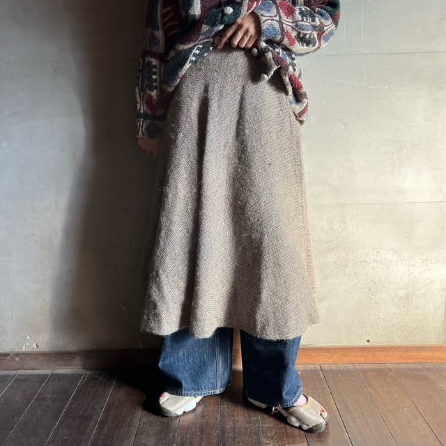 Aラインが可愛いウールのスカート。 ざっくりとした柔らかく動きやすい生地で ポケット上にボタンがついていて、ファスナーはついていませんが中が見える作りではないので気にならないかと思います。 裏地はついていませんのでデニムやサテンパンツなどのレイヤードも色々と楽しんで合わせていただけたらと思います。 【着用スタッフ身長】 161cm 【平置き実寸(cm)】 着丈 / 81 ウエスト / 32 ※ホックの位置を変えて5センチほどウエストを広げることも可能です。お気軽にお申し付けください。 素材:表記なし ダメージ:特筆するダメージはありません。 ――――――――――――――――――――――――――――――――― 〇ご購入前にお読みください〇 ●梱包資材については簡易包装とさせていただいておりますので内袋に入れずに発送しております。 ●当店の商品は全てUSED商品のため、記載がなくても多少の使用感はあります。デッドストックなどの場合は表記しております。 ●ダメージにつきましては、ごく小さいものや当店基準でほぼ目立たないと判断したものは記載を省略する場合があります。 ●できる限り実物に近い色味の写真の掲載を心がけておりますが、お使いのブラウザにより差が出ることがあります。 ●商品は実店舗でも販売しております。管理には細心の注意を払っていますが、ご注文と同時に店頭で売り切れてしまう可能性があります。そのような場合は、こちらでキャンセルさせていただきます。ご了承くださいませ。 ●サイズ、色味のイメージ違いなど、お客様都合での返品交換はお断りさせていただいております。 ●USED商品に慣れていない方、神経質な方はご購入をお控えください。 ●発送やお問い合わせの返信につきましては、即日を心がけていますが店舗休業日は発送等を行なっておりません。翌営業日までお待ちください。