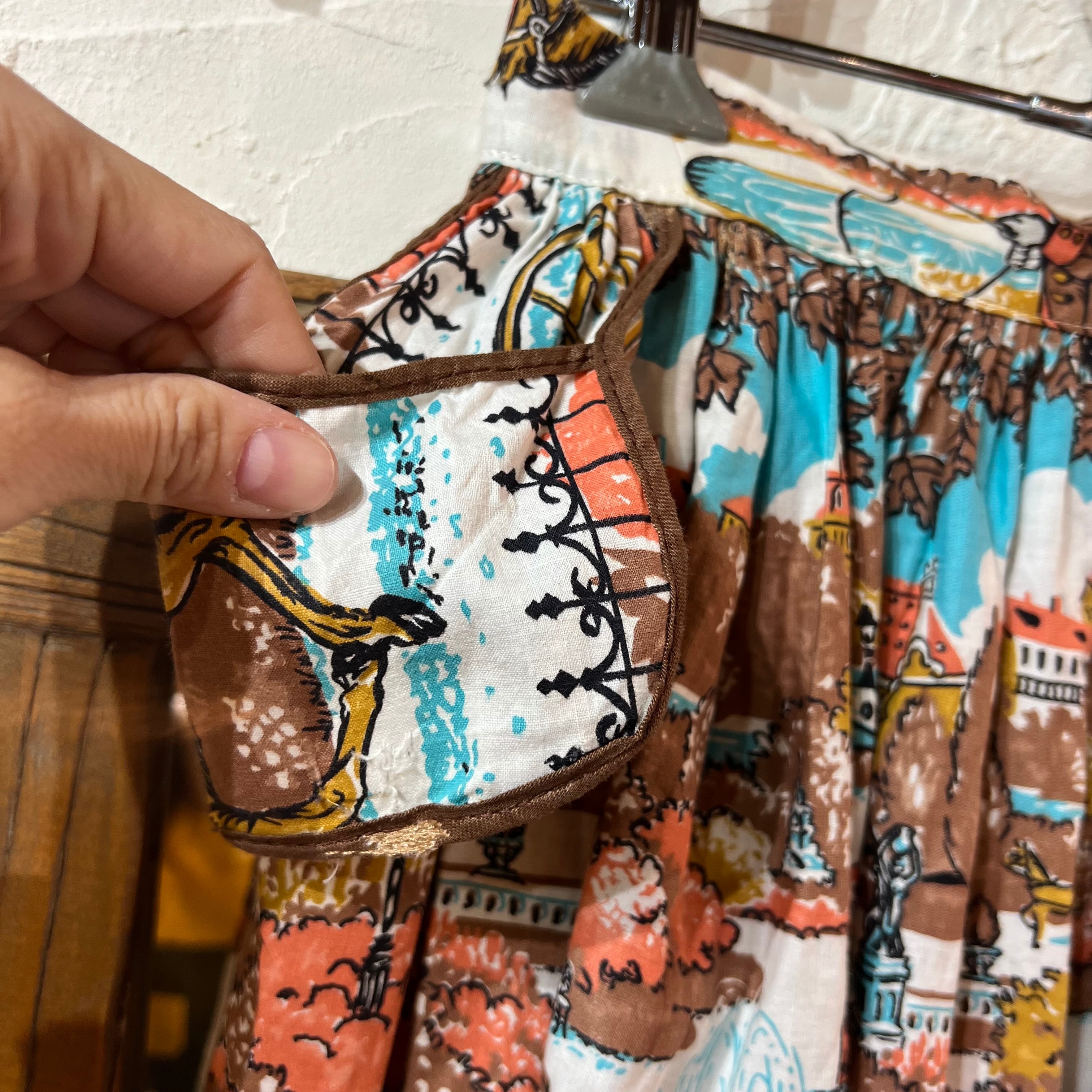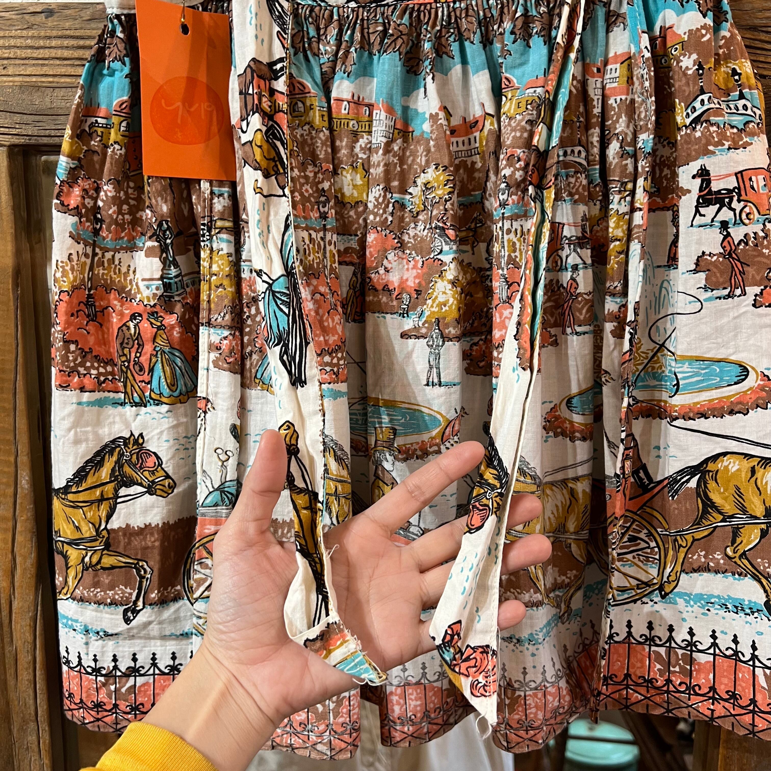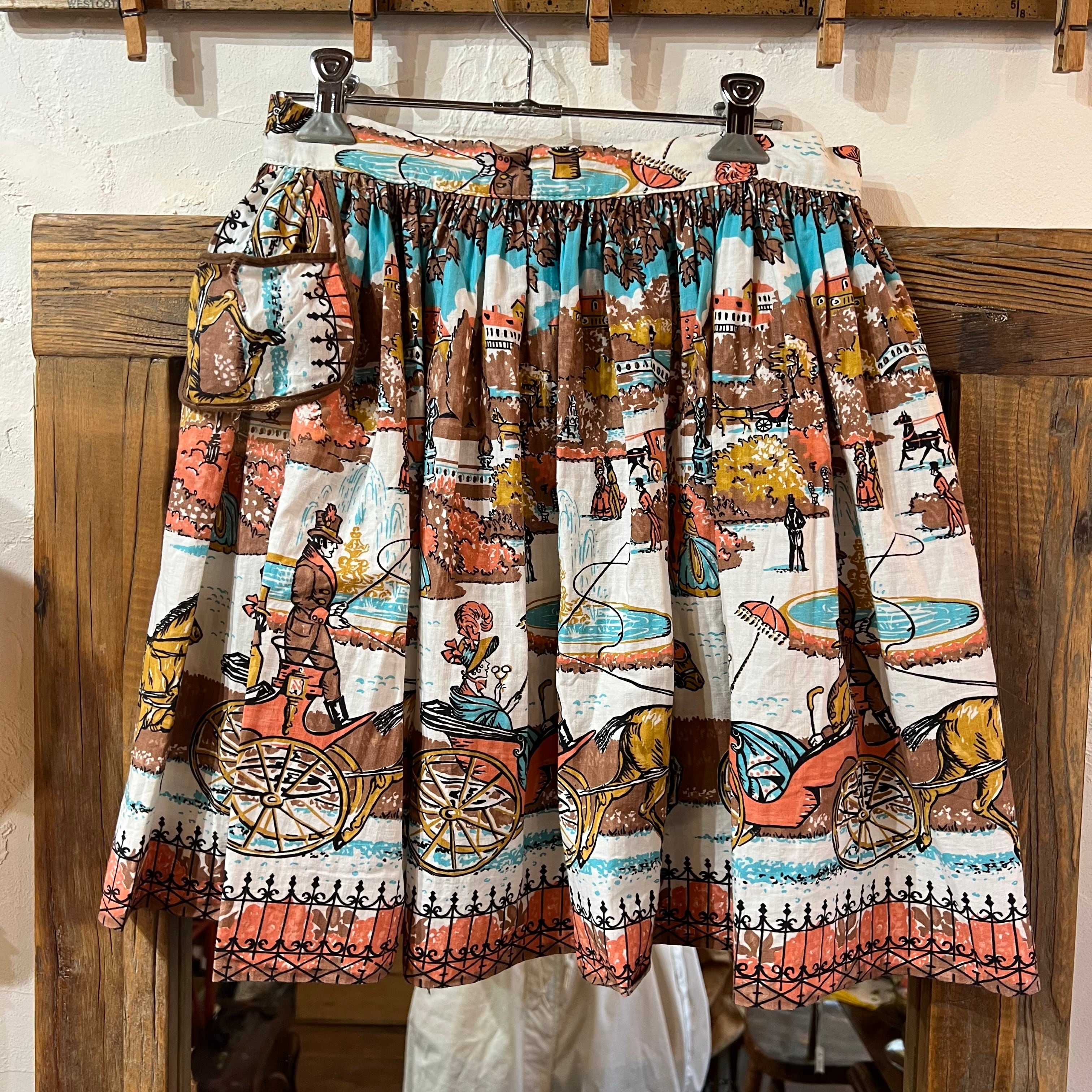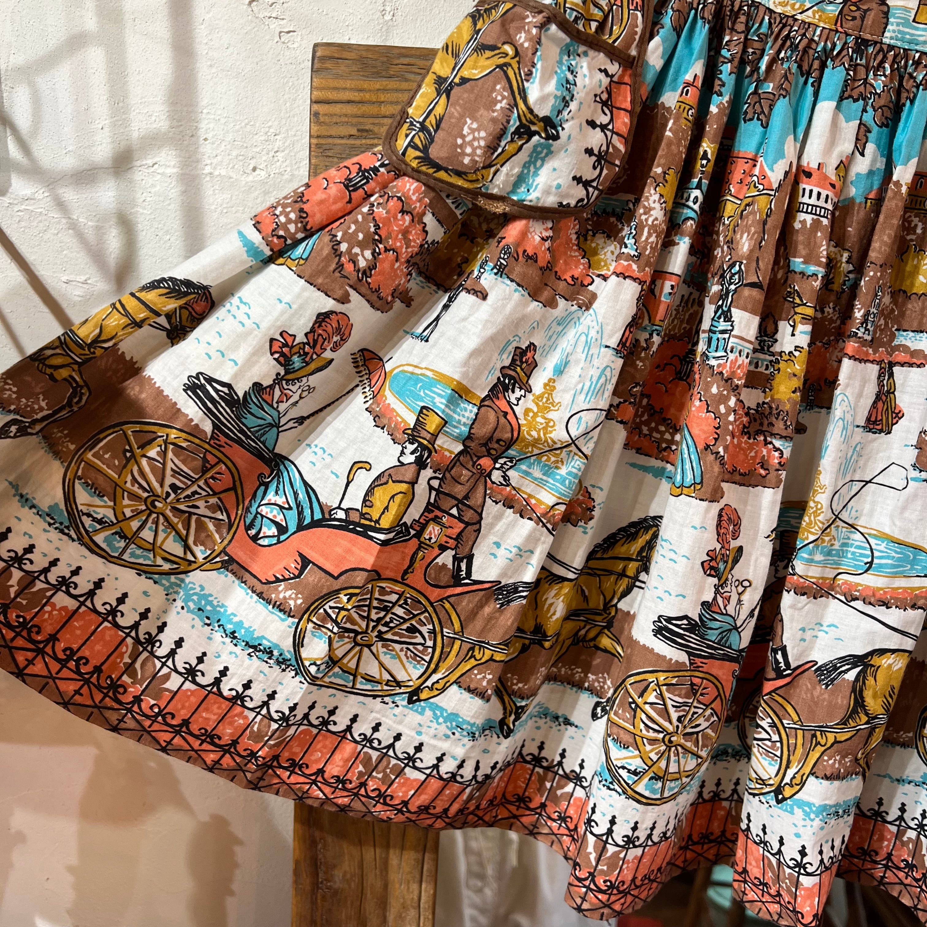 中世のヨーロッパの街並みや馬車のイラストが素敵なエプロン。