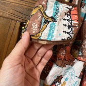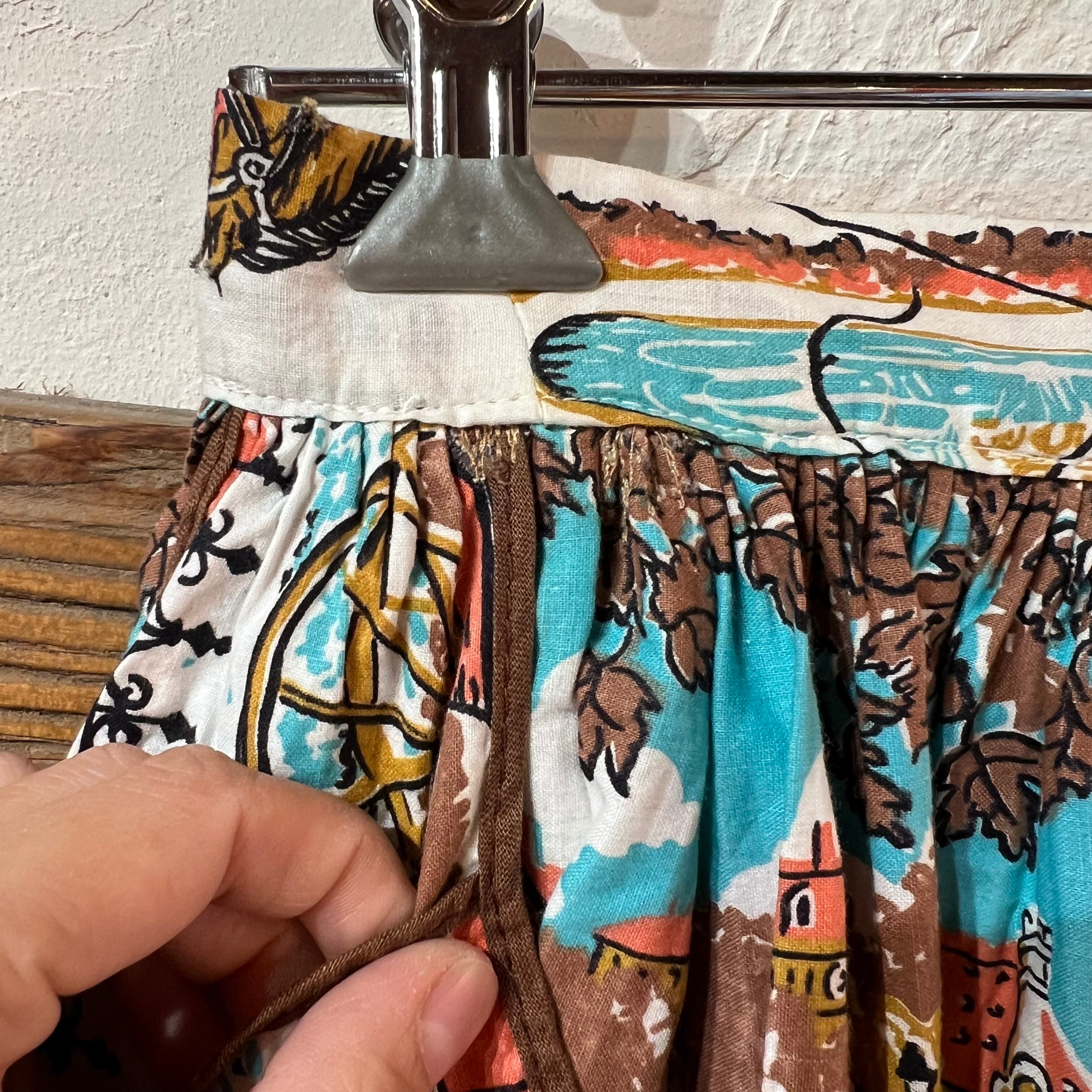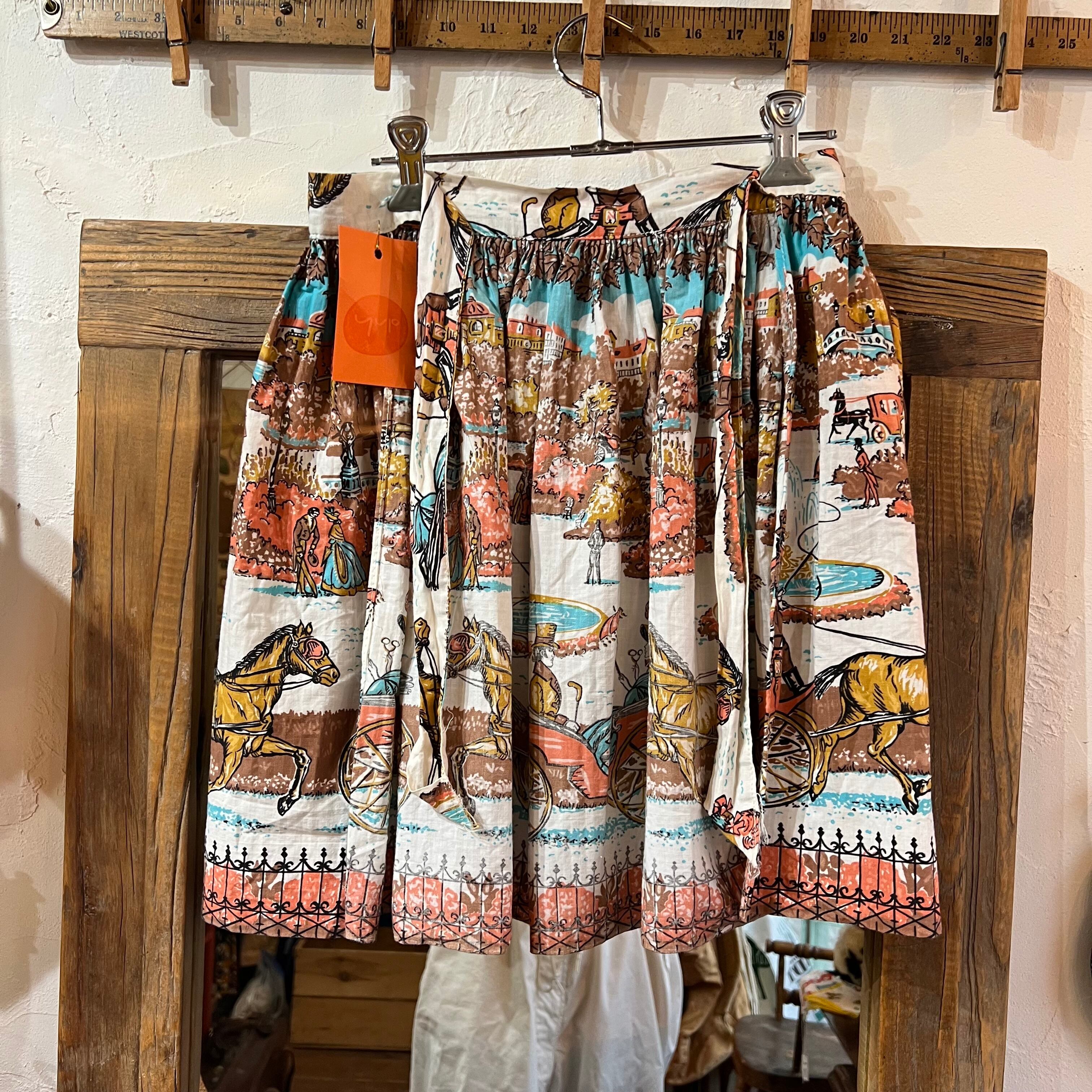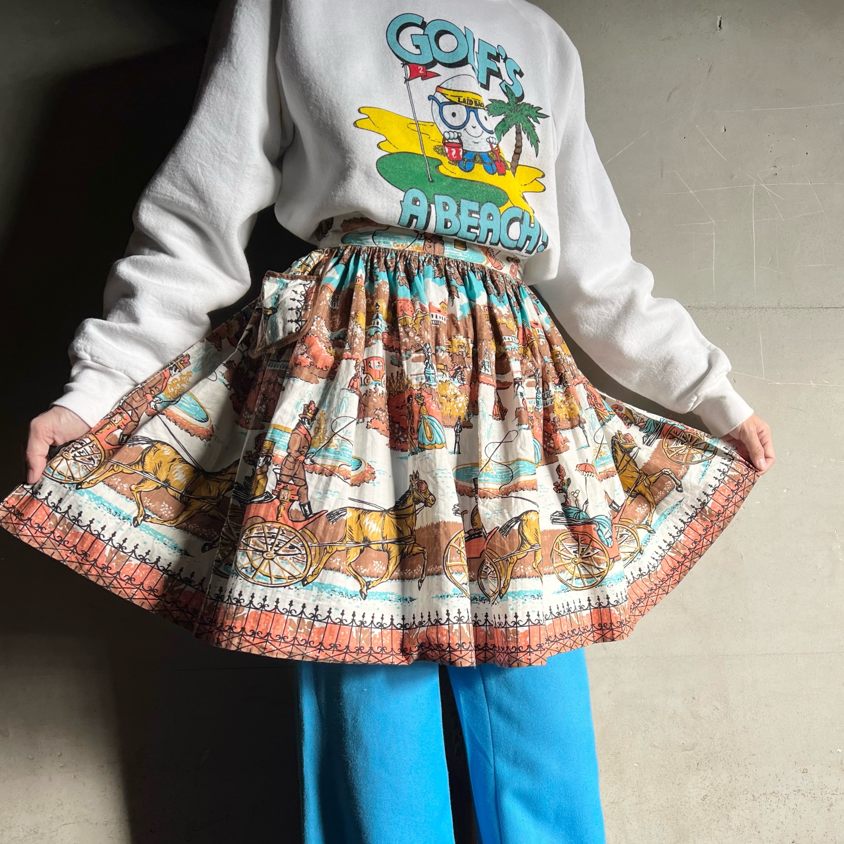 中世のヨーロッパの街並みや馬車のイラストが素敵なエプロン。