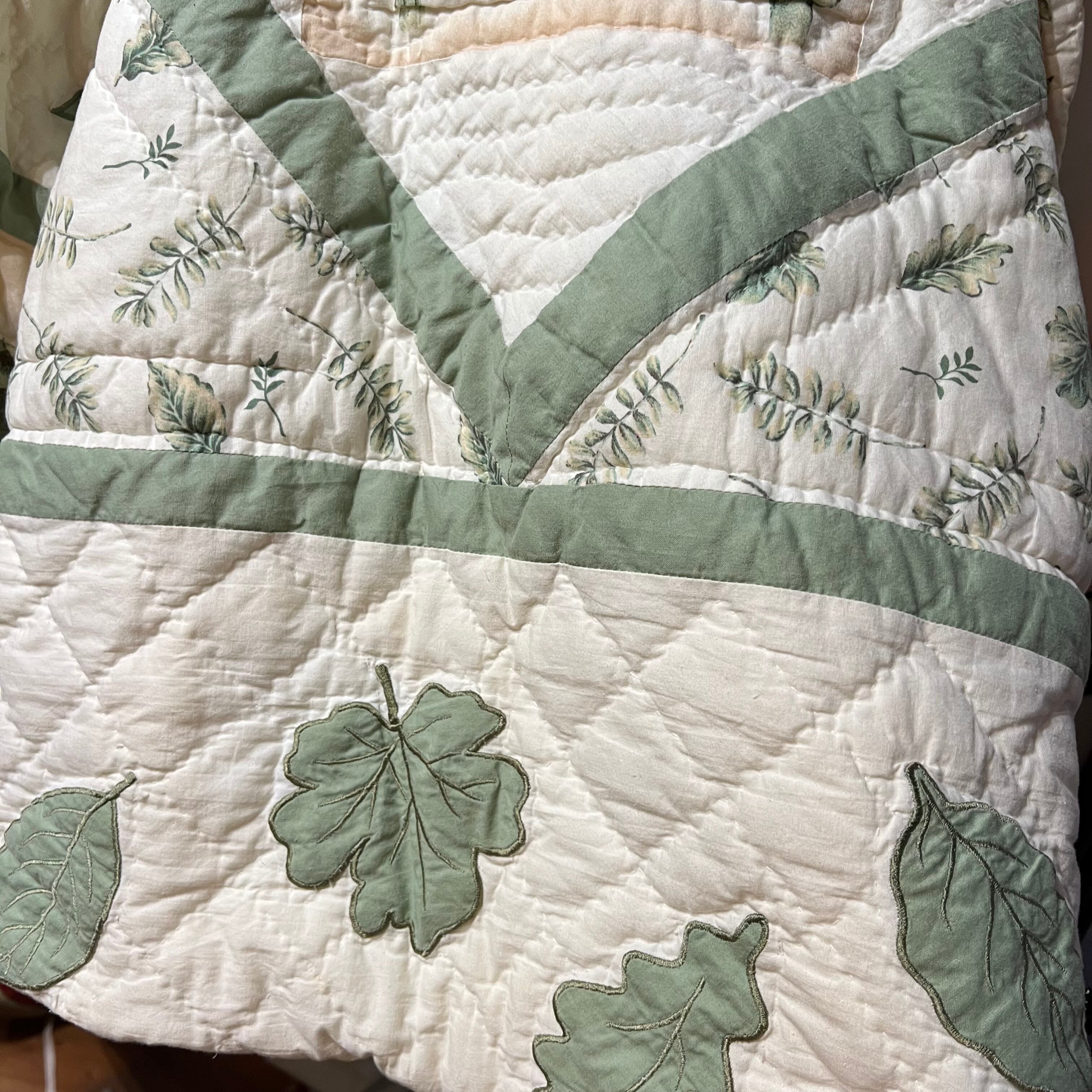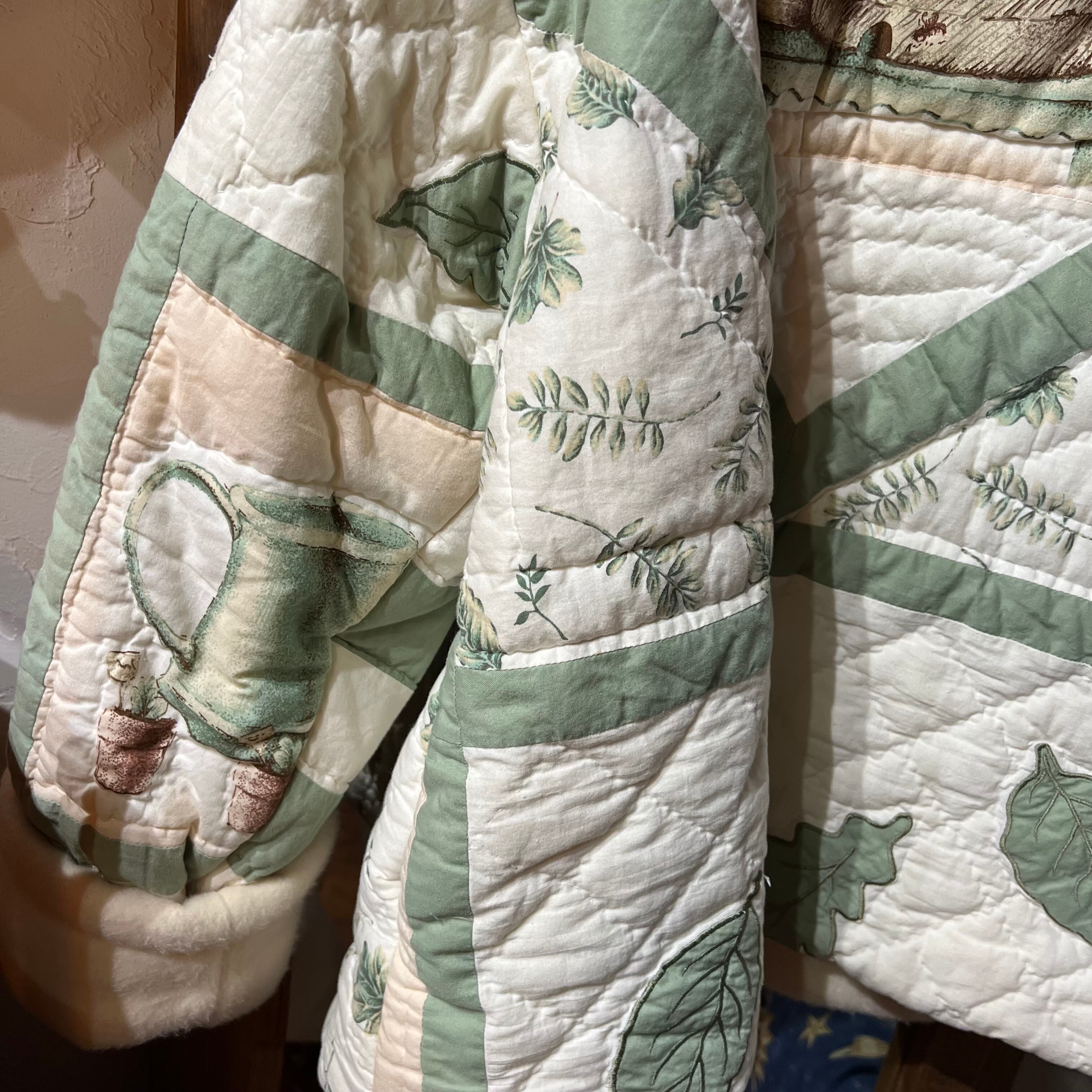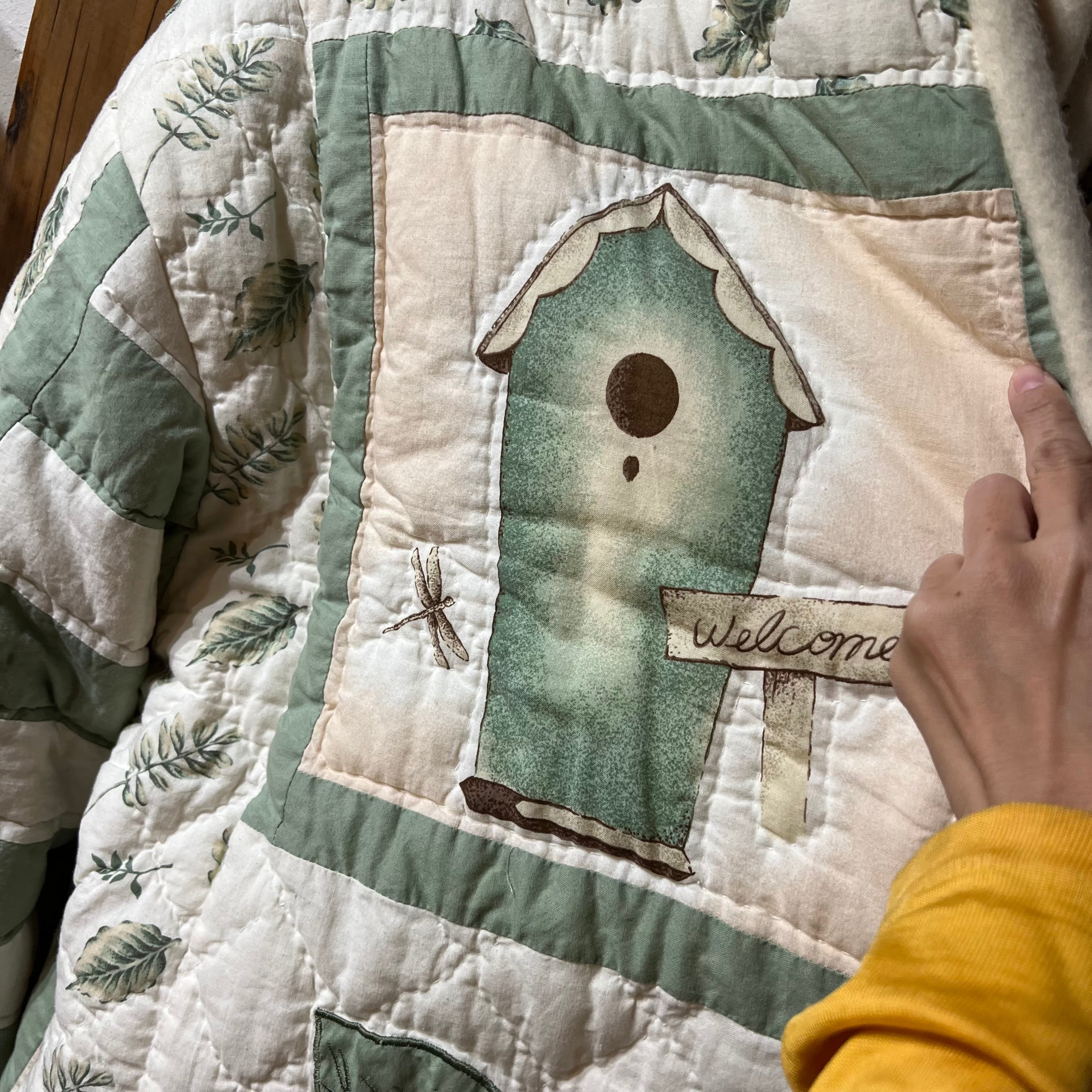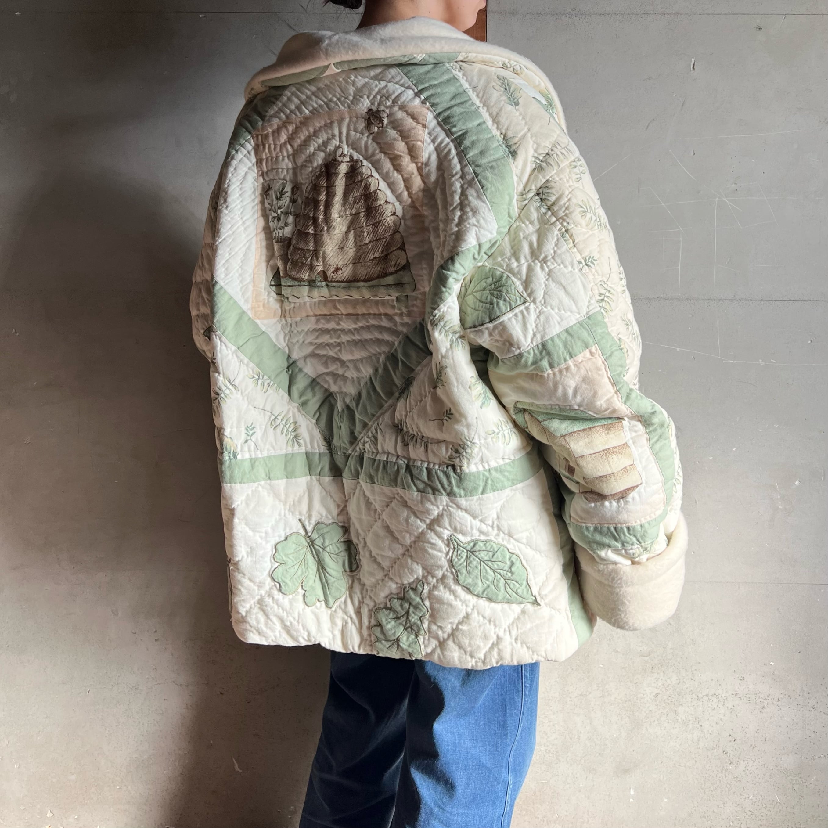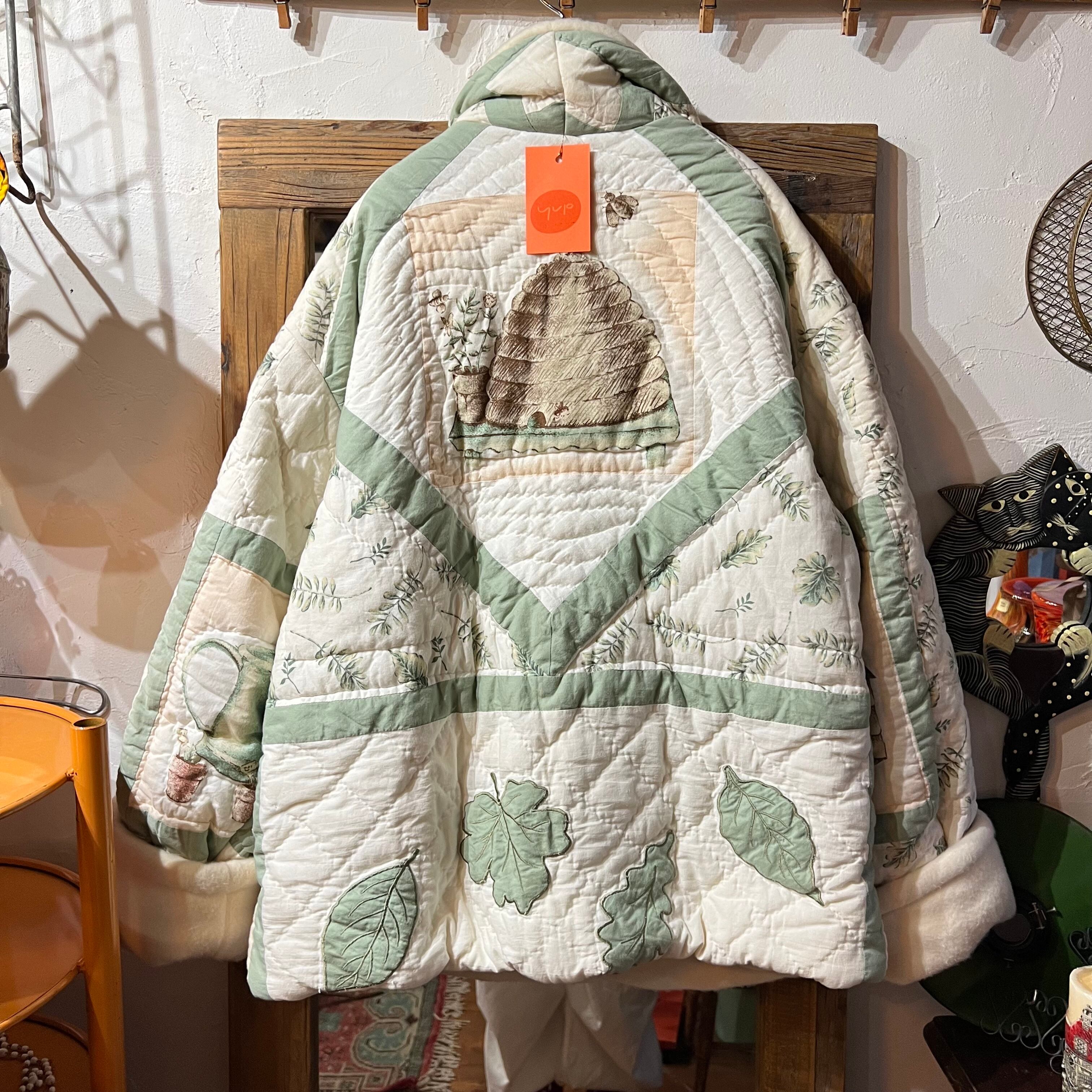 鳥小屋やジョウロや蜂の巣な、葉っぱなどのイラストとパッチワークが可愛い一点。