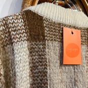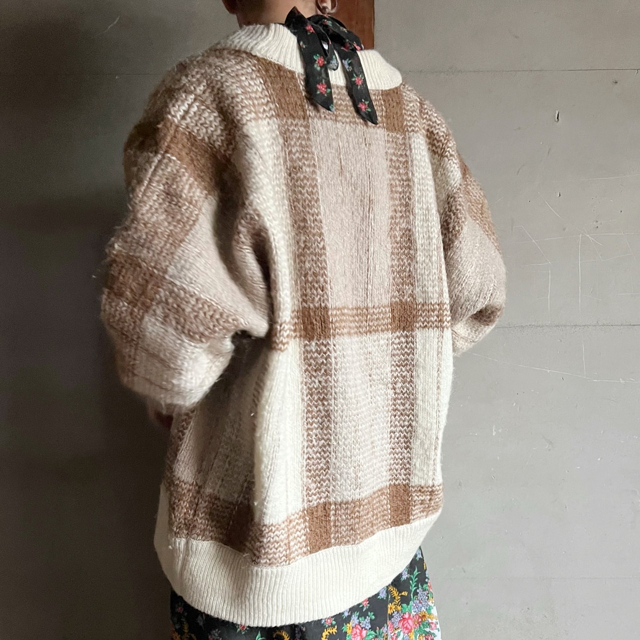 ベージュカラーのチェック模様のモヘア風カーディガン。
