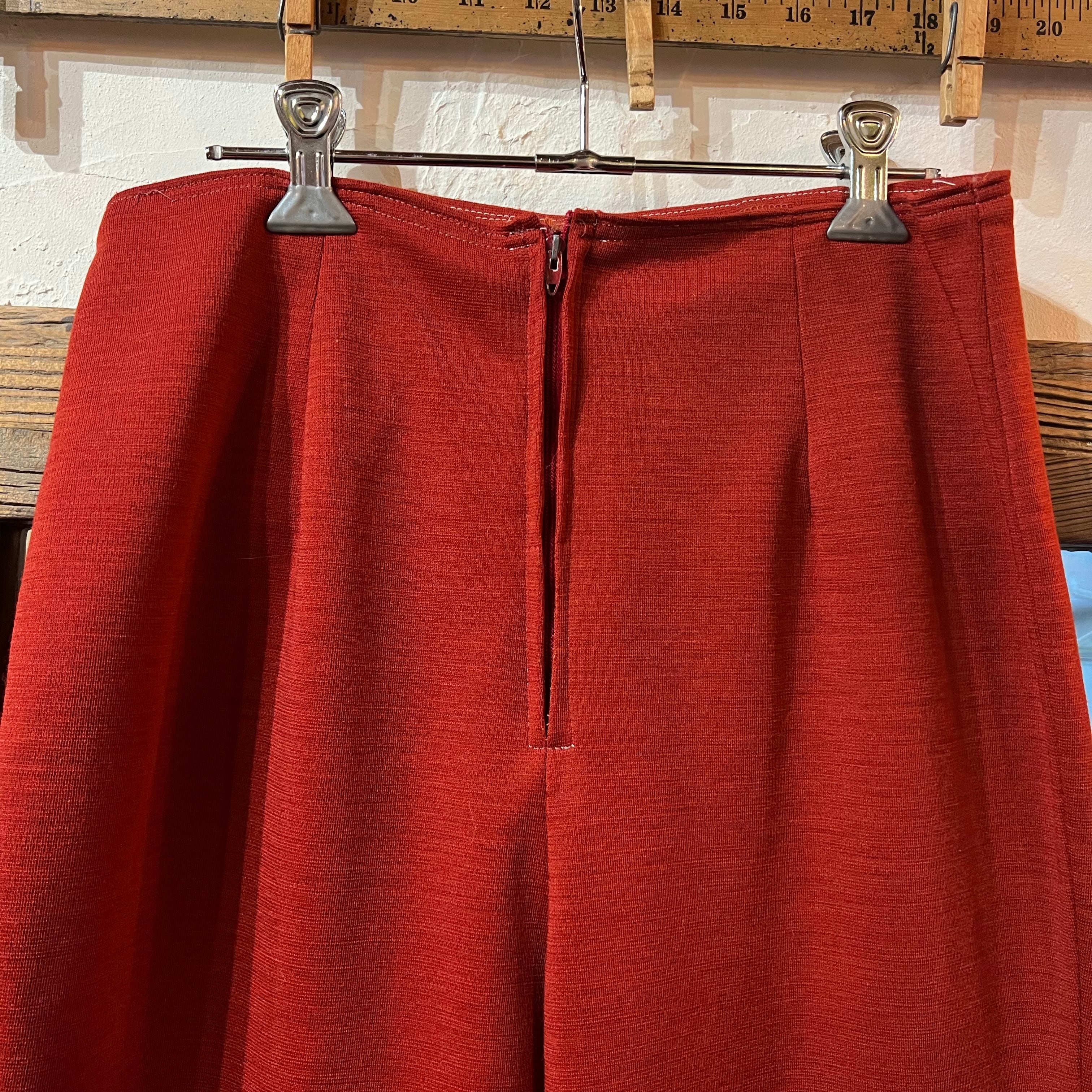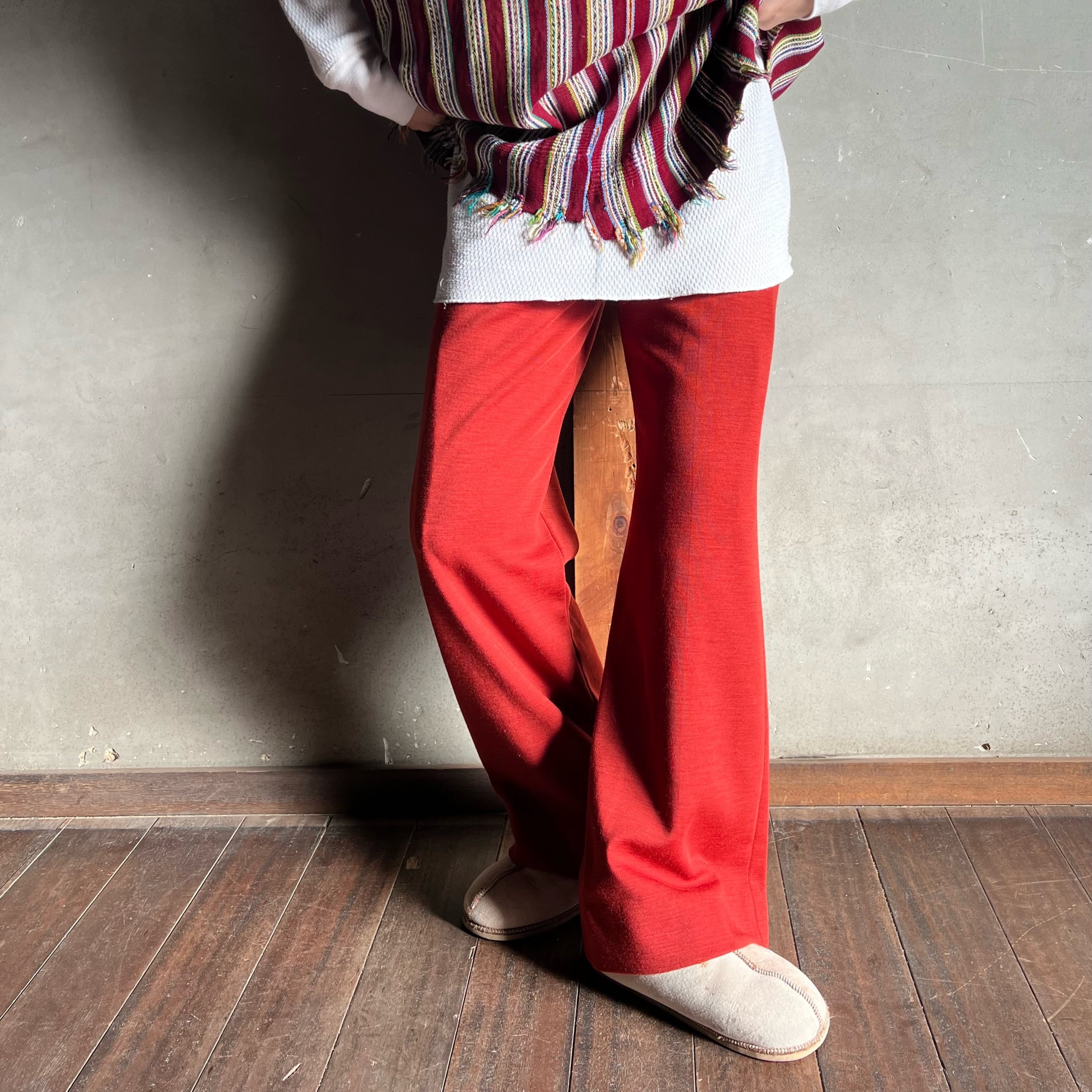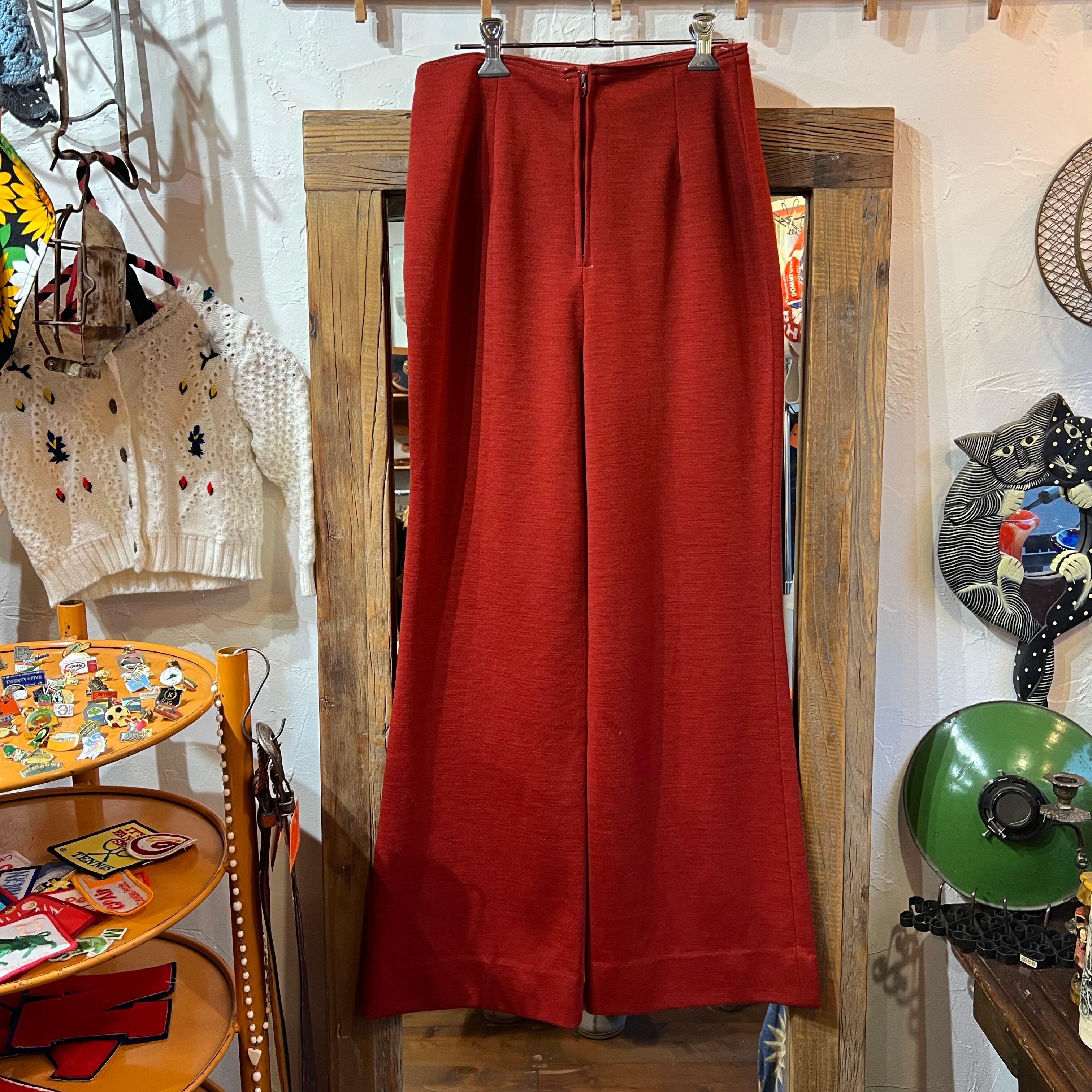 レンガ色のフレアパンツ。