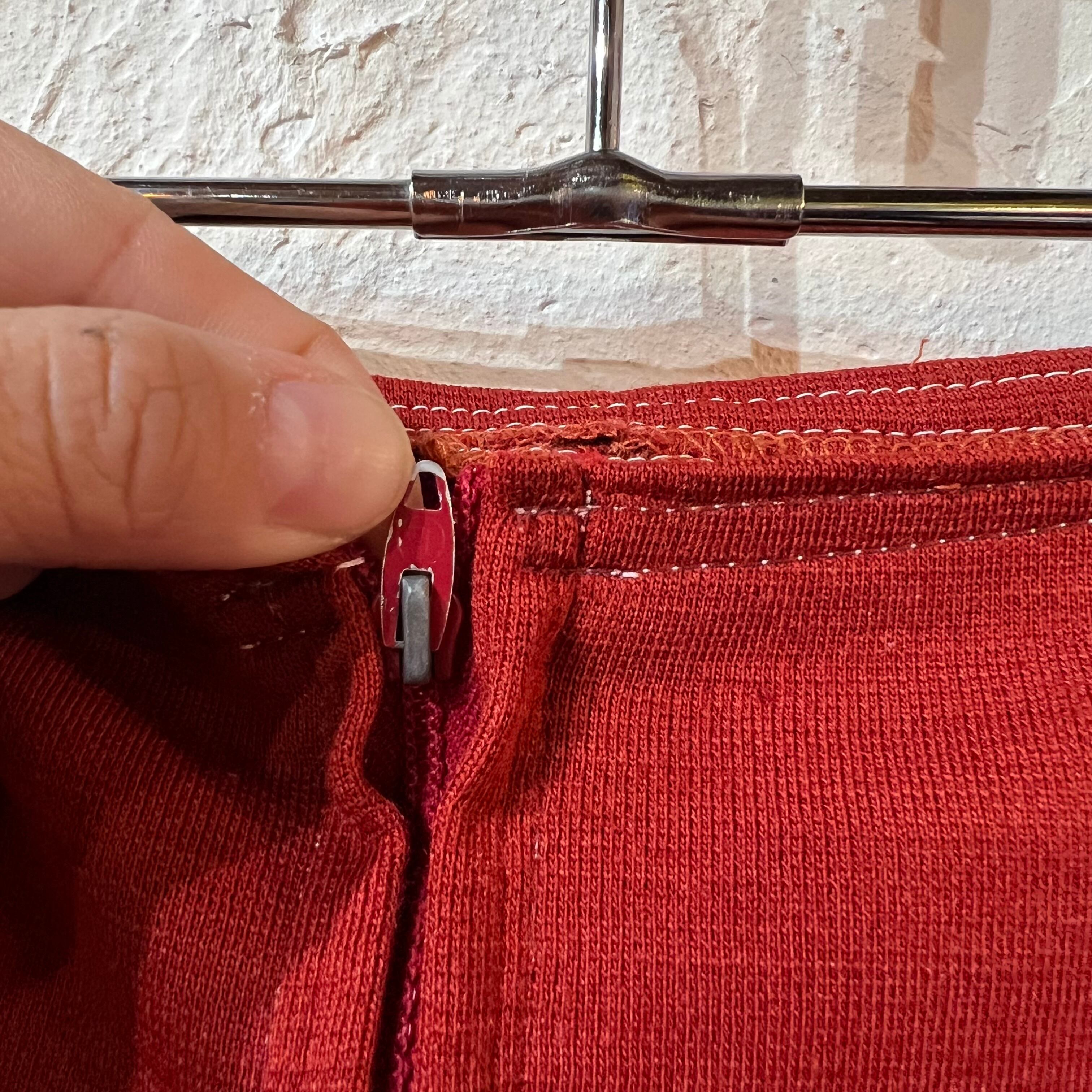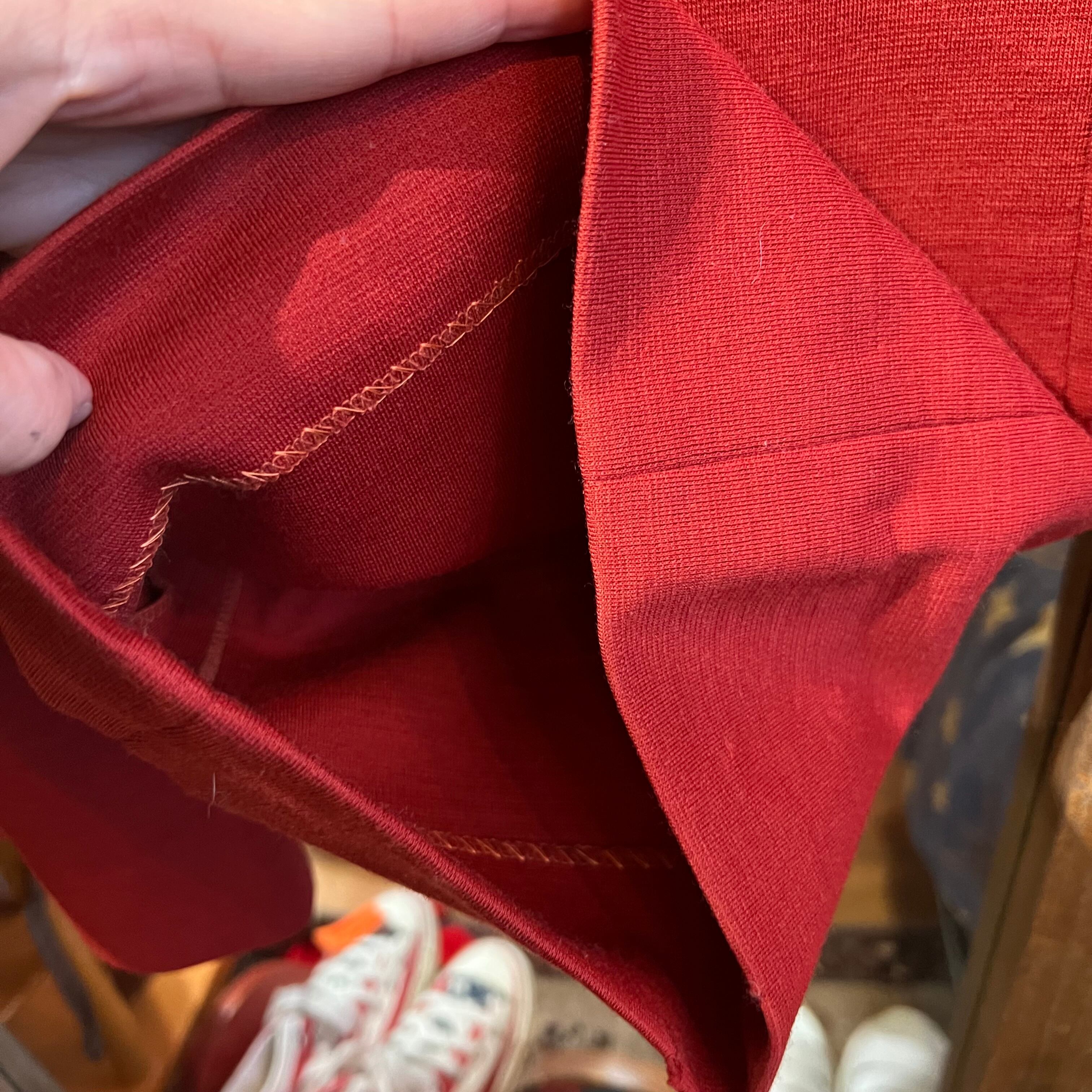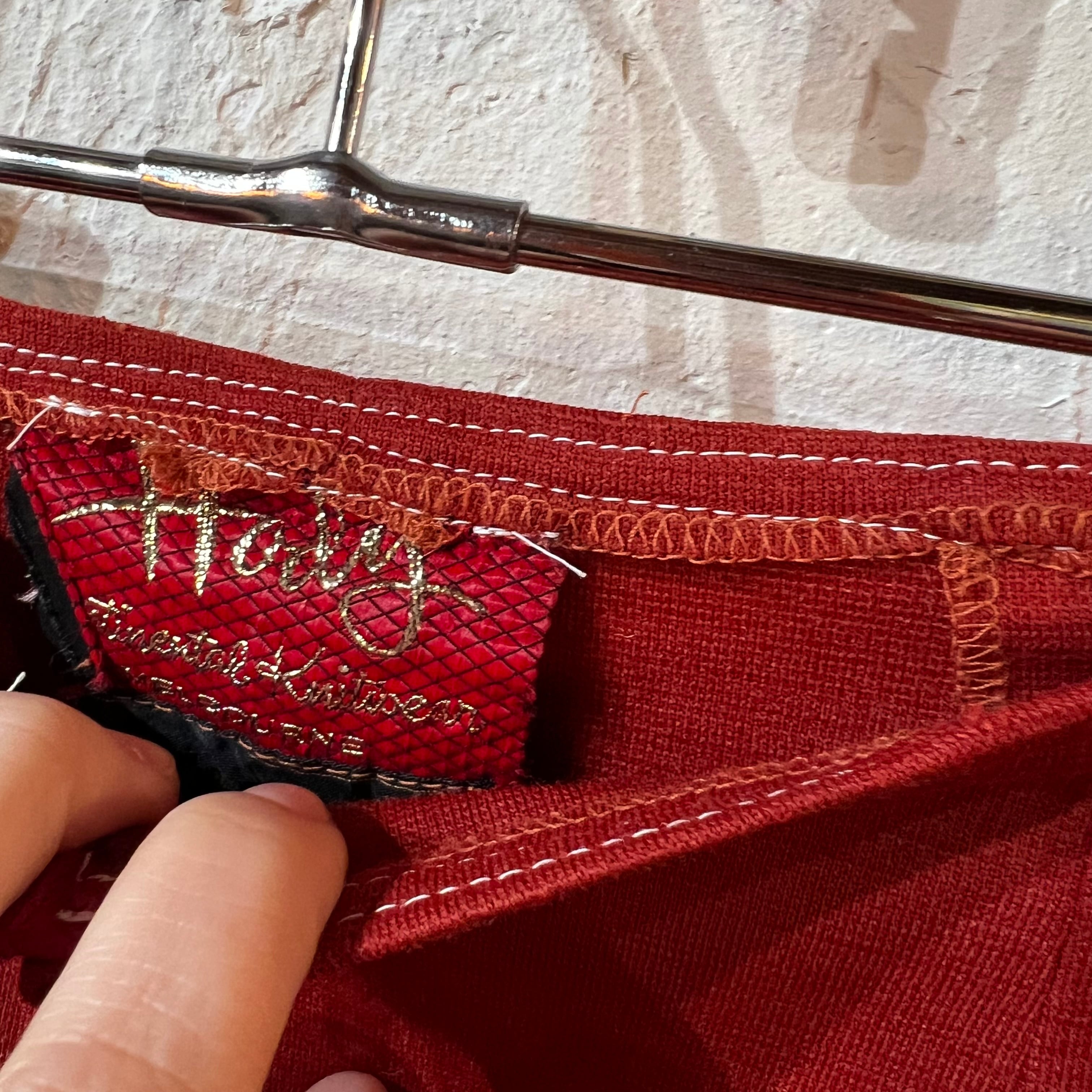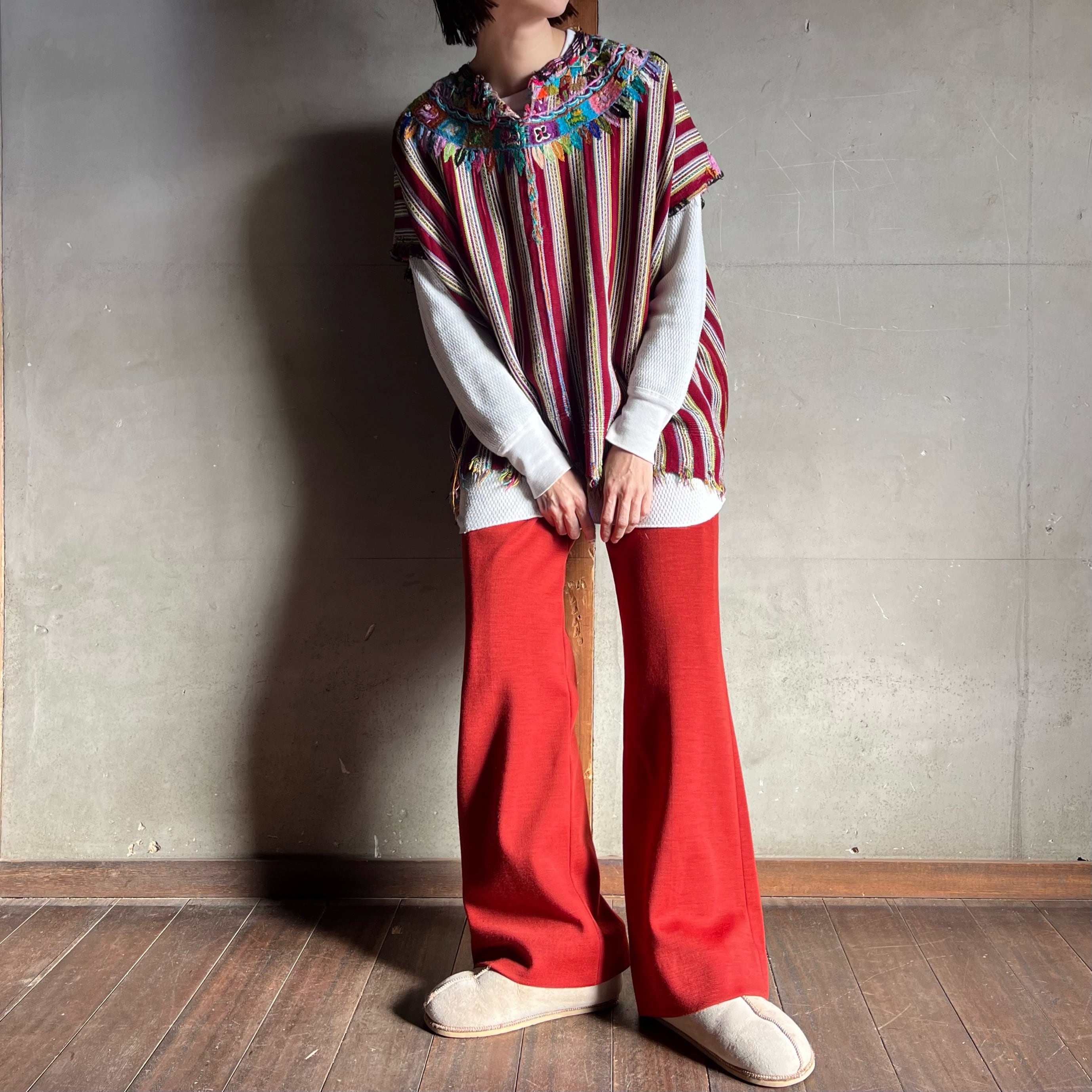 レンガ色のフレアパンツ。