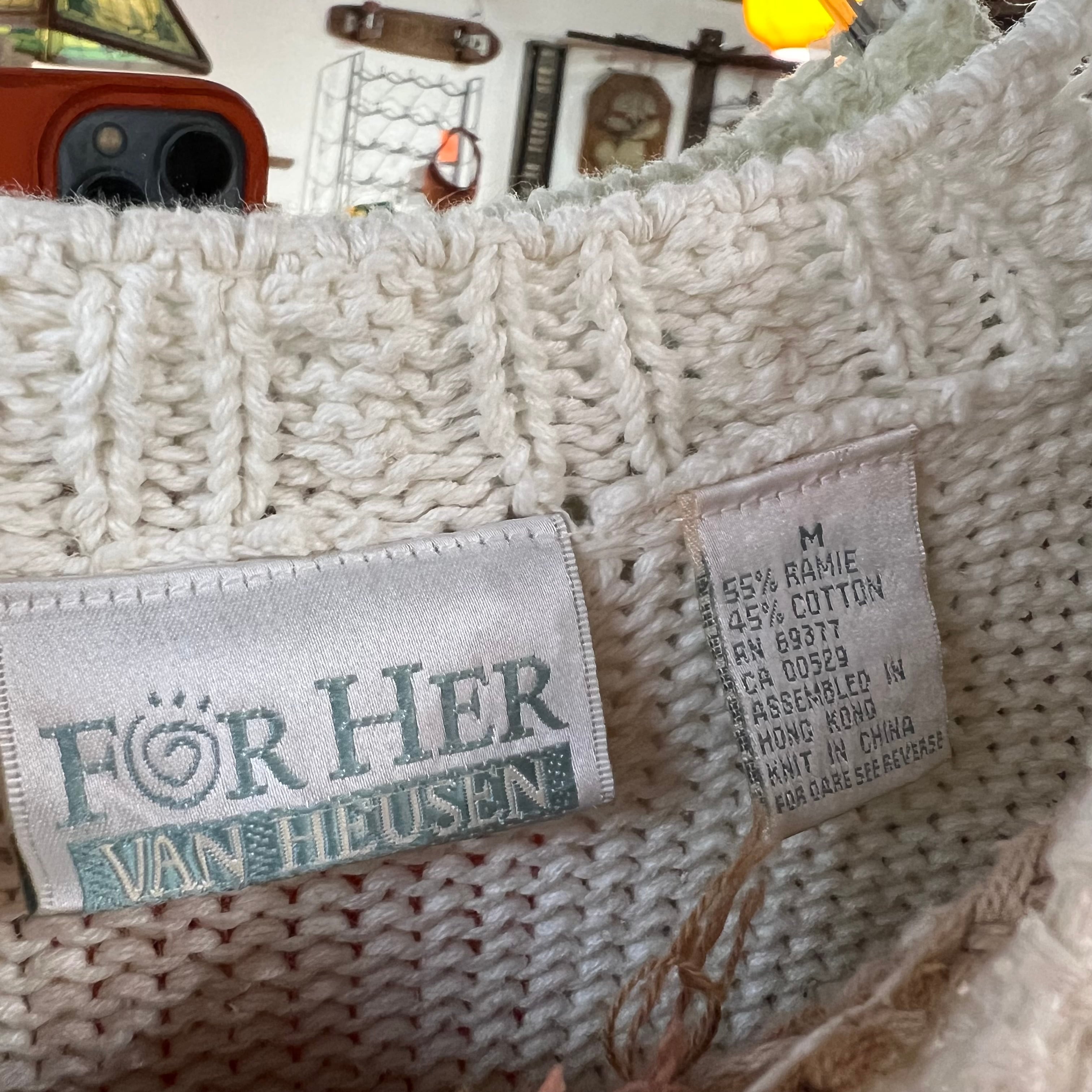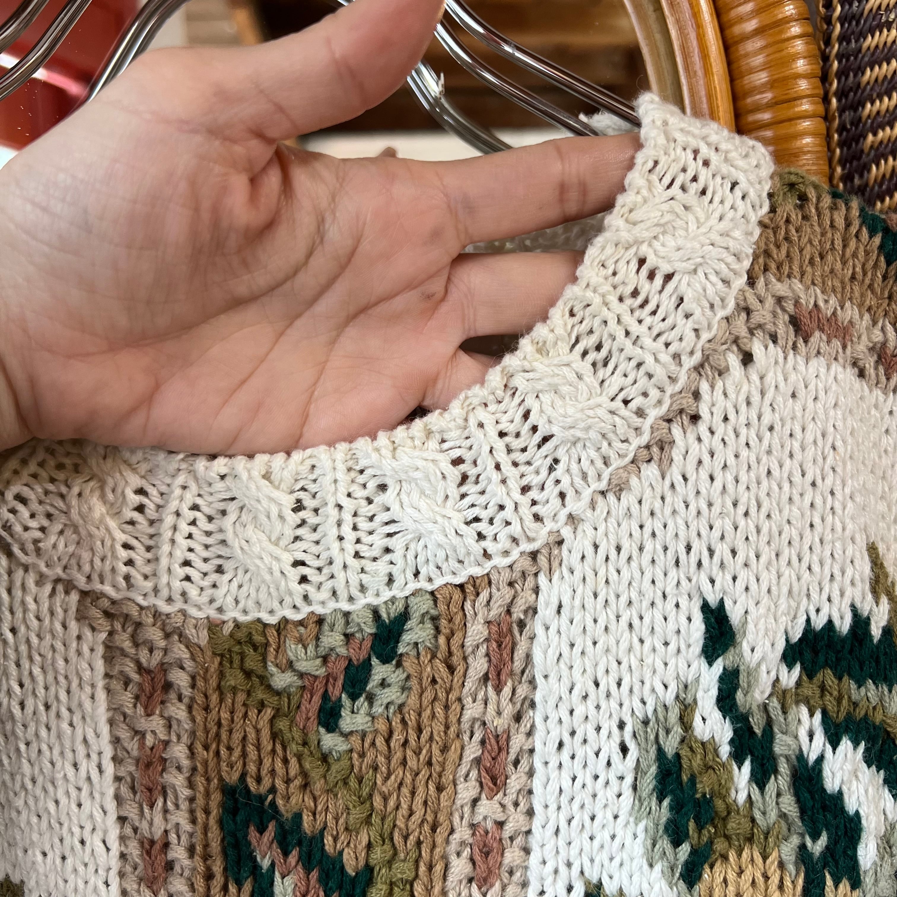 春らしいカラーで形はシンプル、コットンとラミーの毛糸で編んであるので程よく重みがありストンとしたシルエットが使いやすいです。