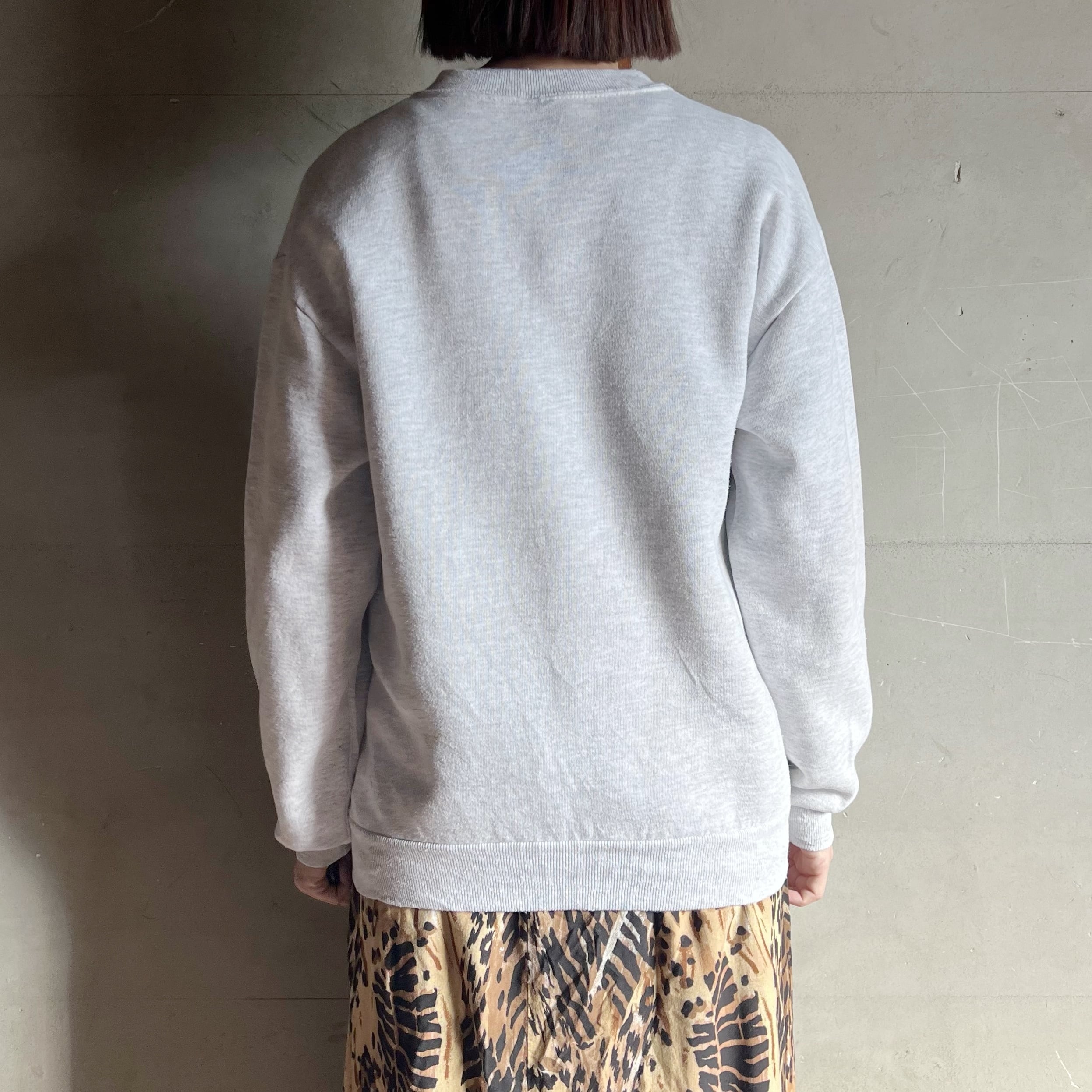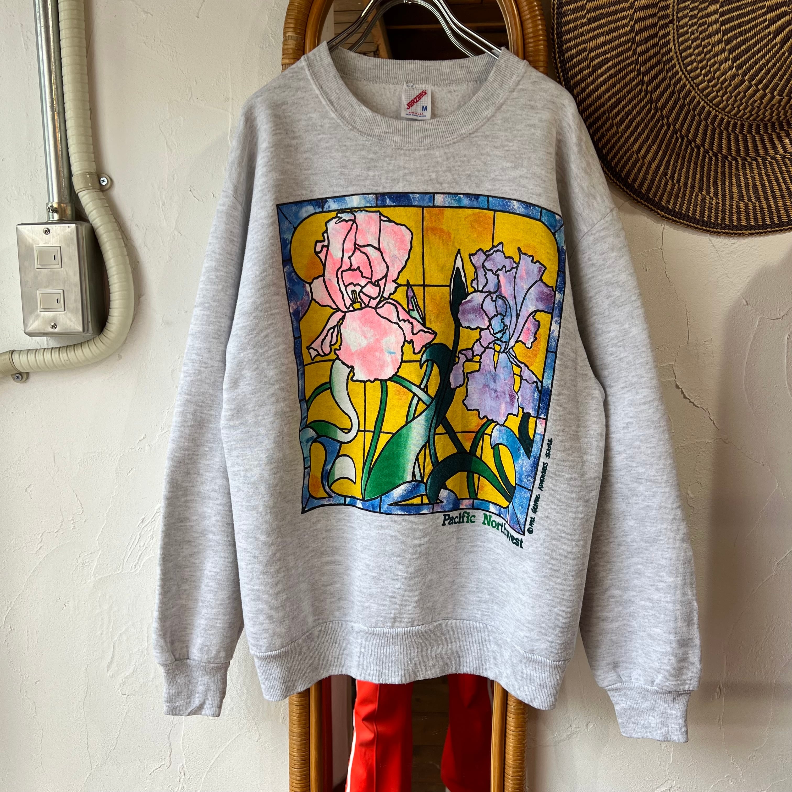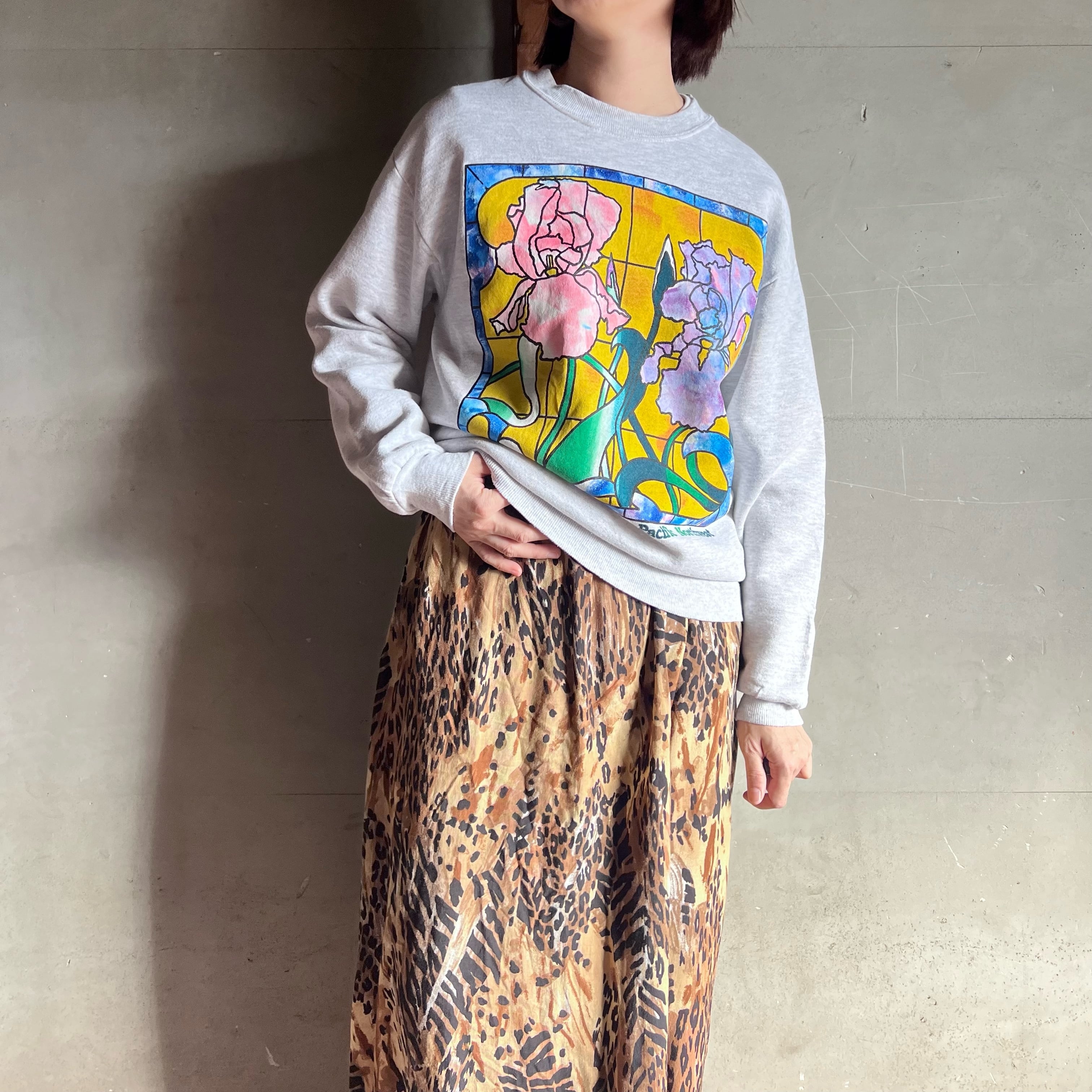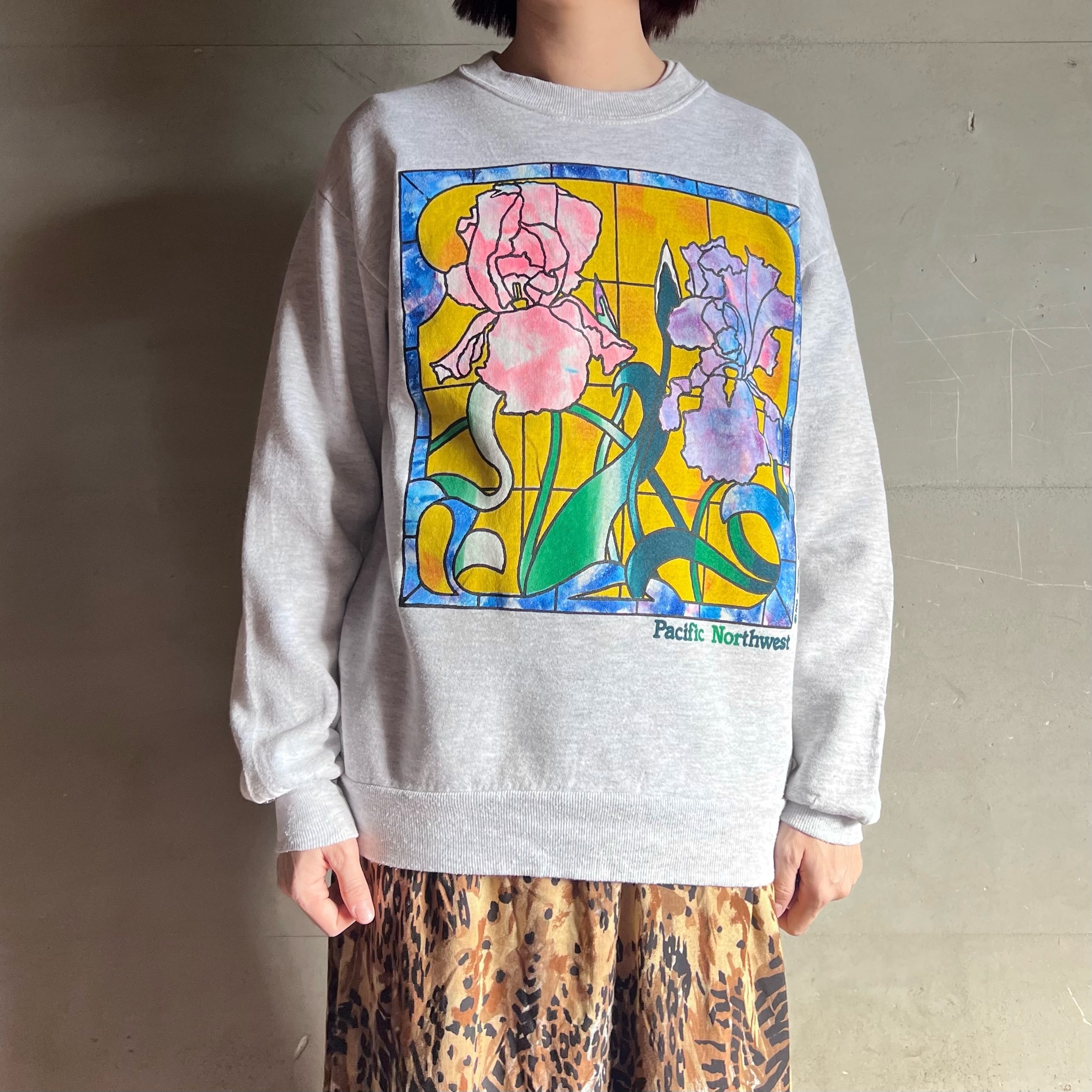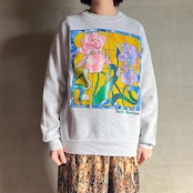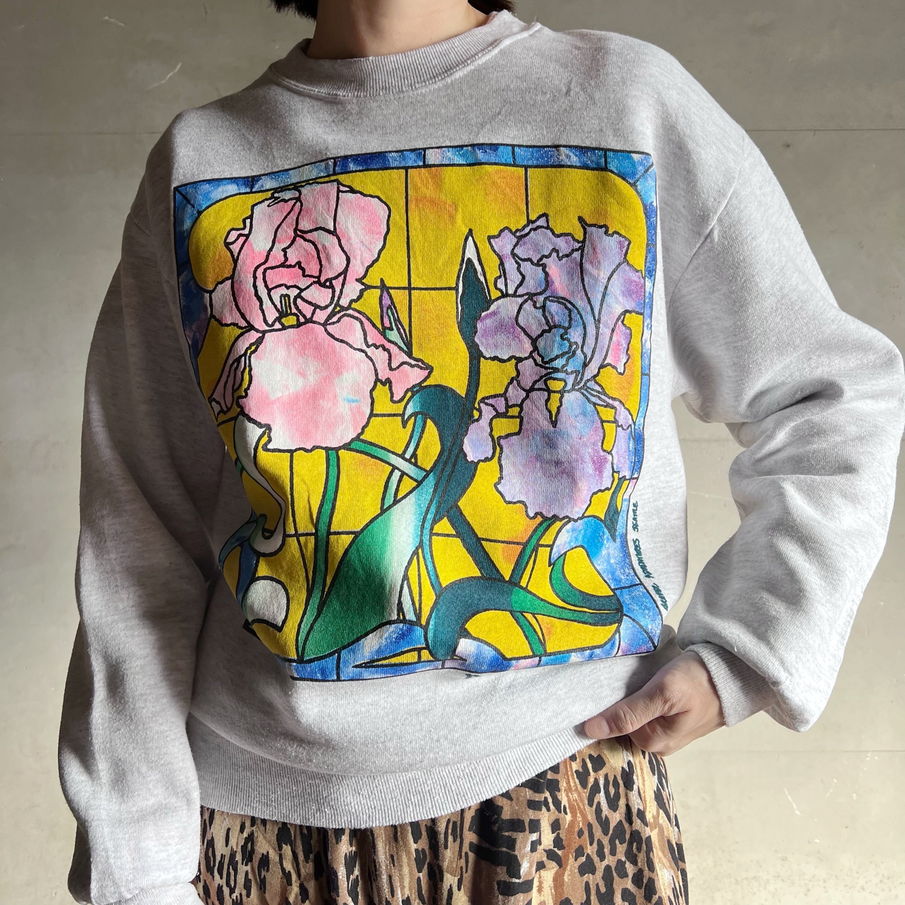 お花のステンドグラスが大きくプリントされた杢グレーのスウェット。