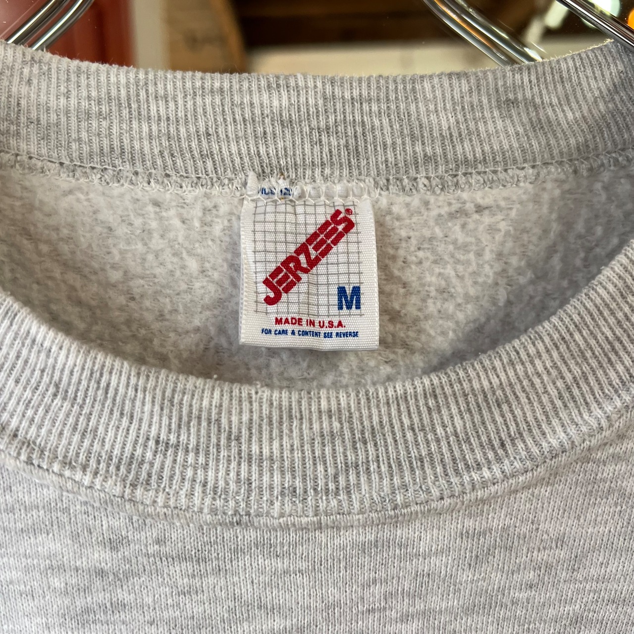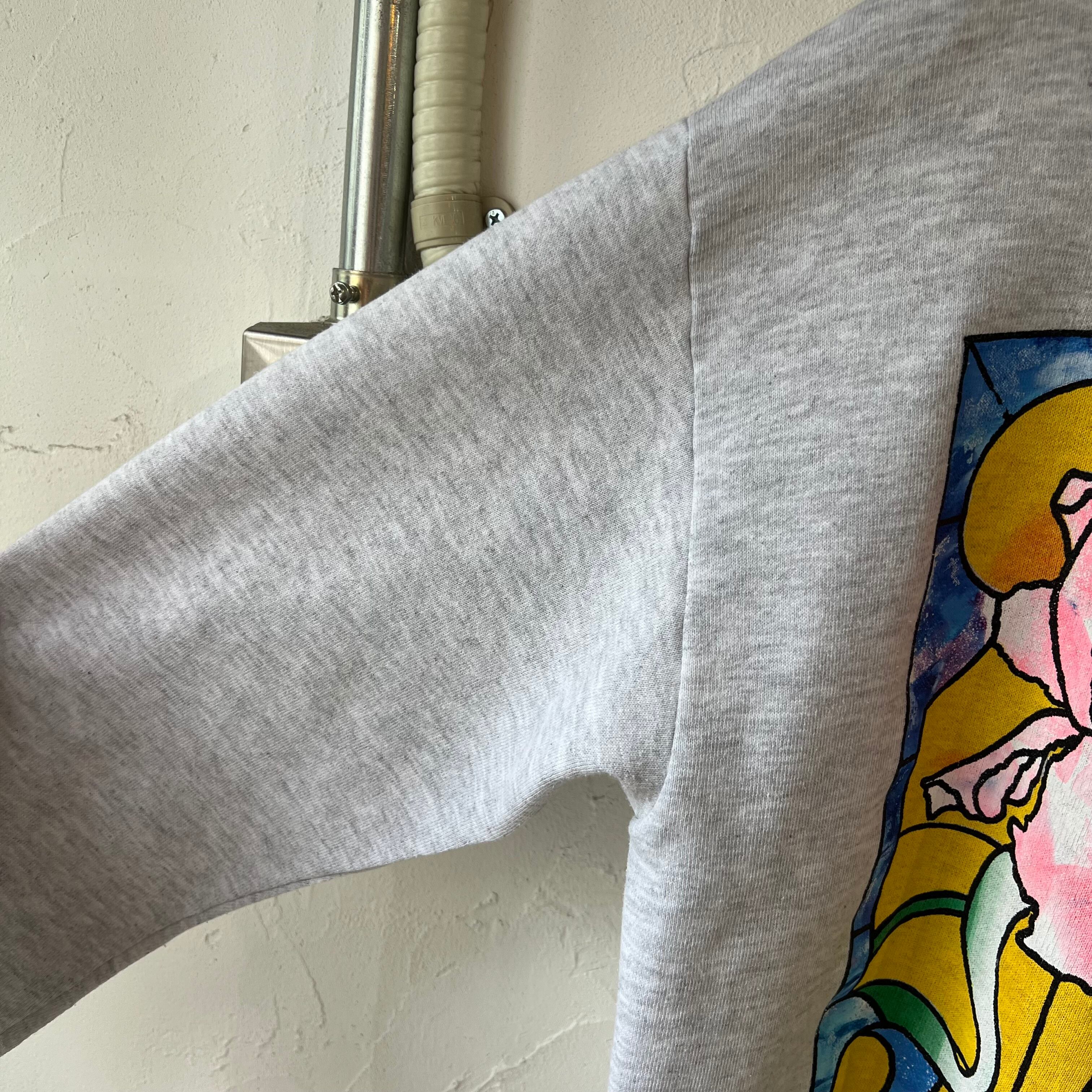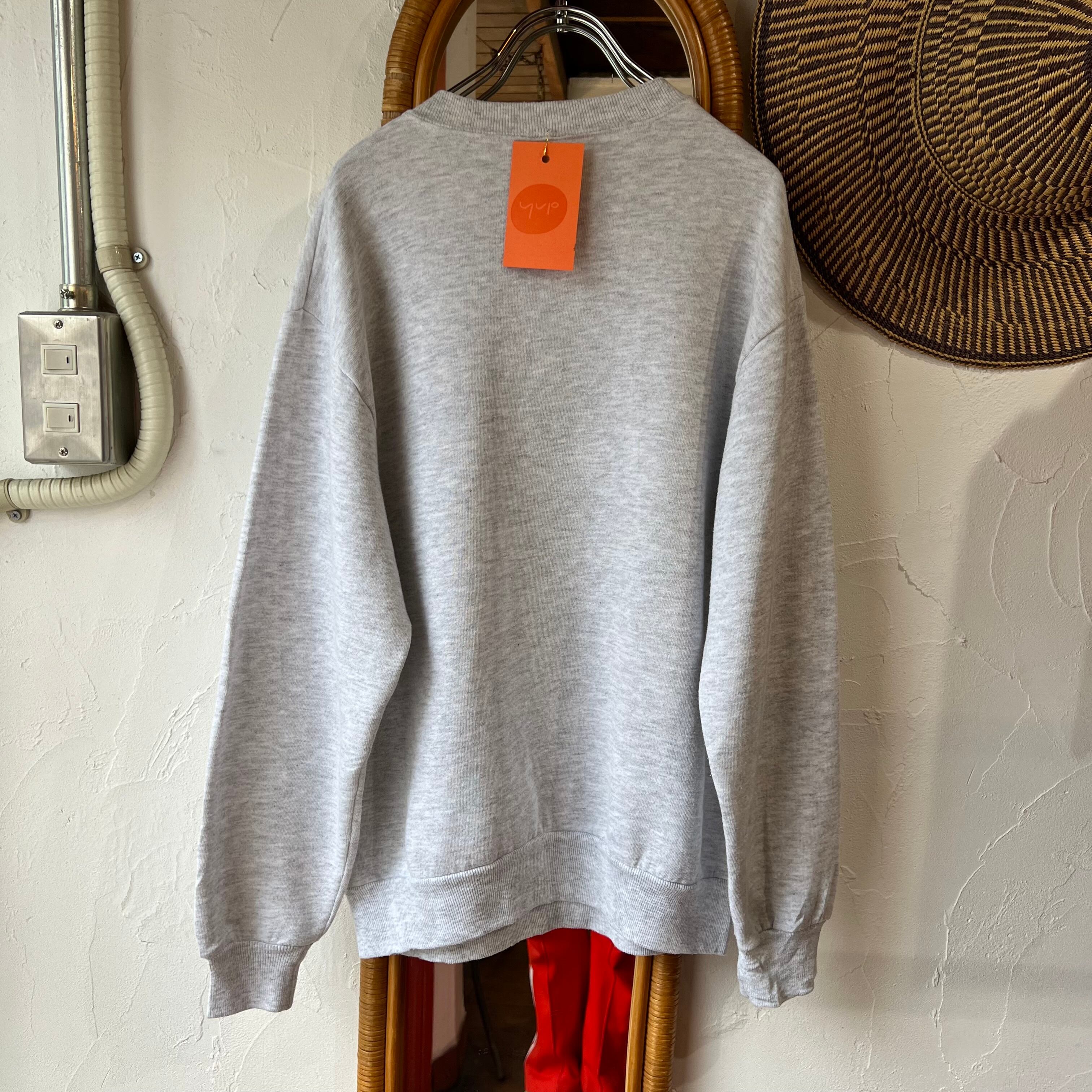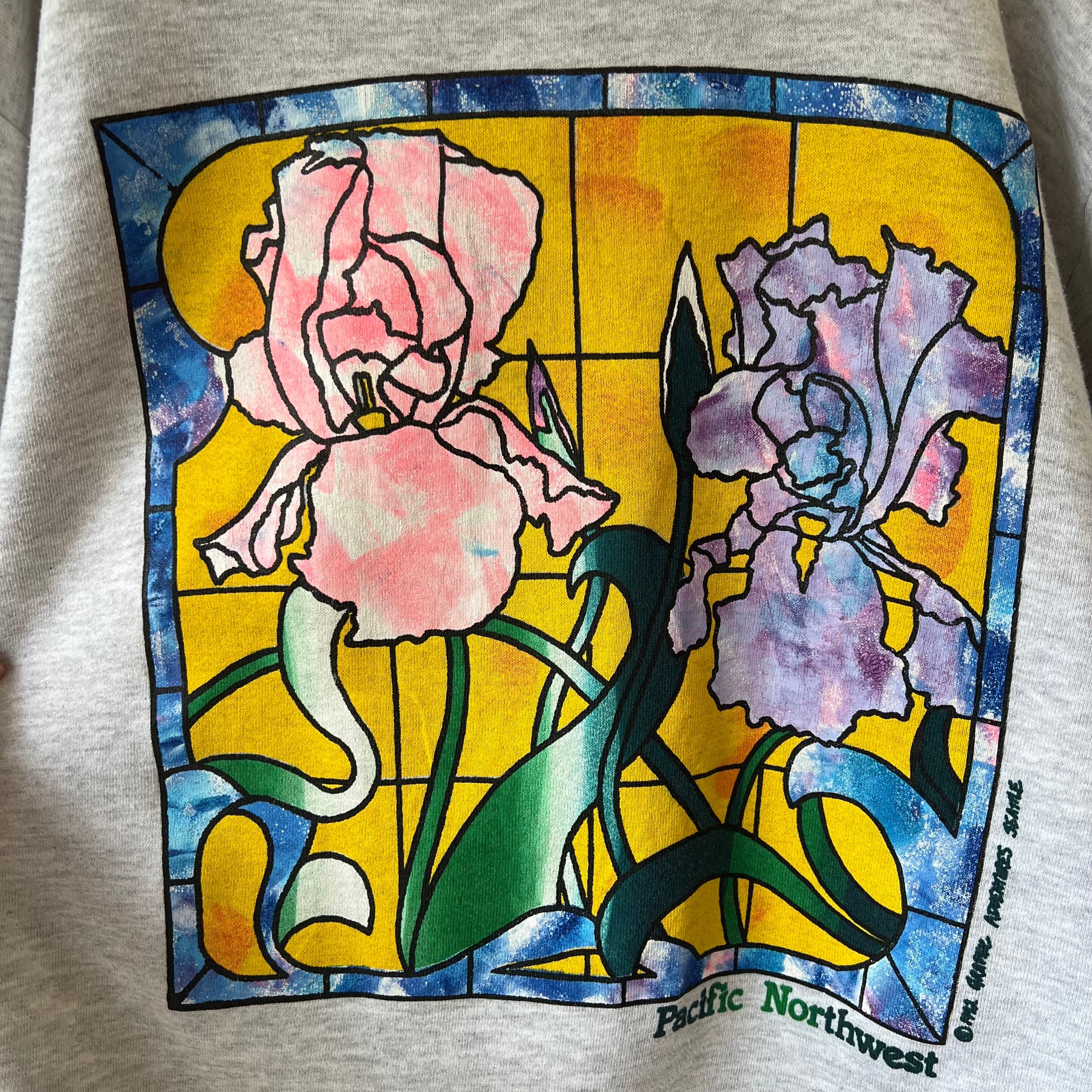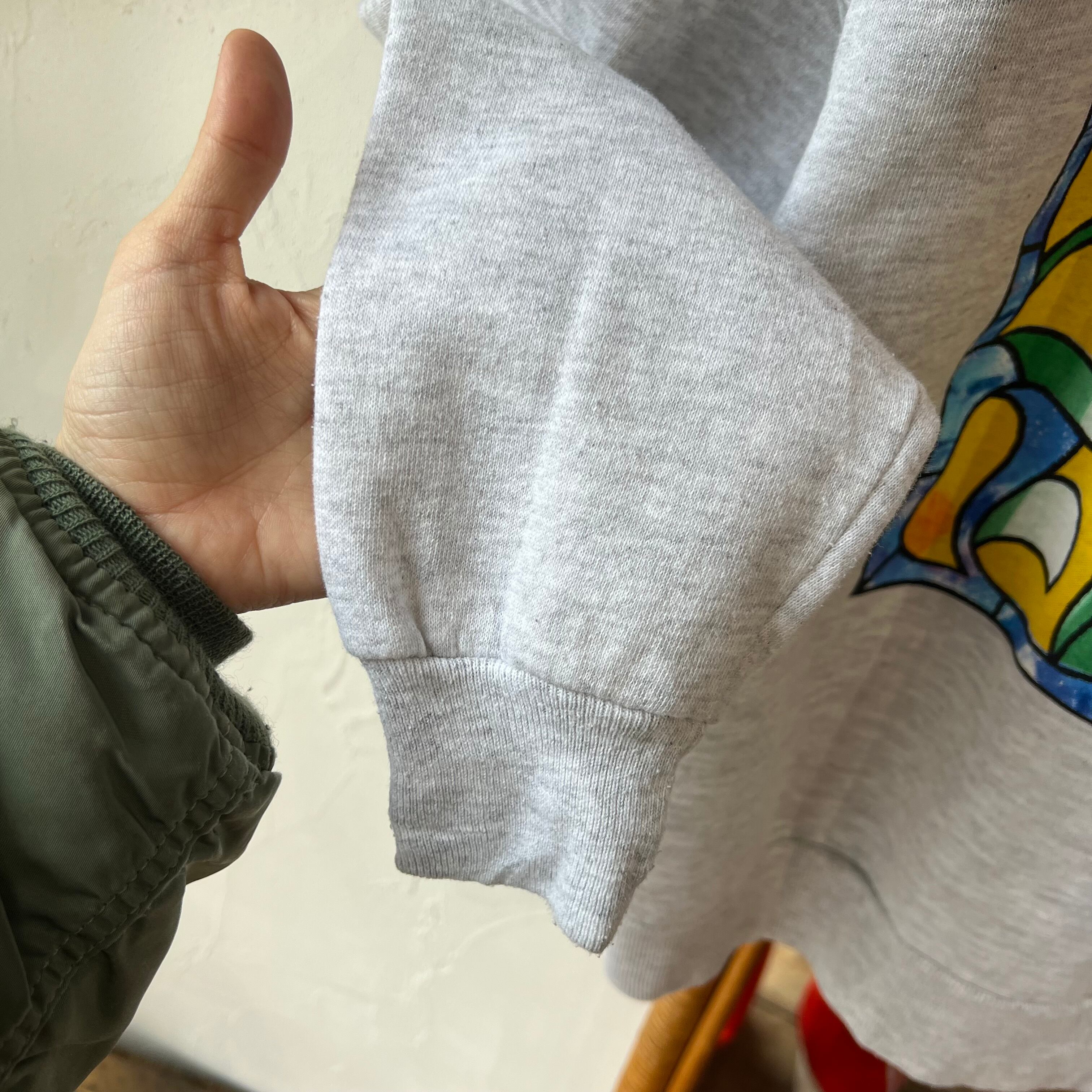 お花のステンドグラスが大きくプリントされた杢グレーのスウェット。