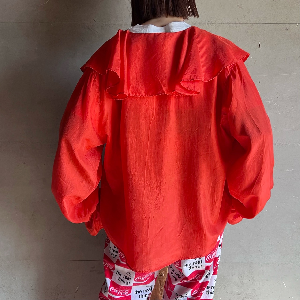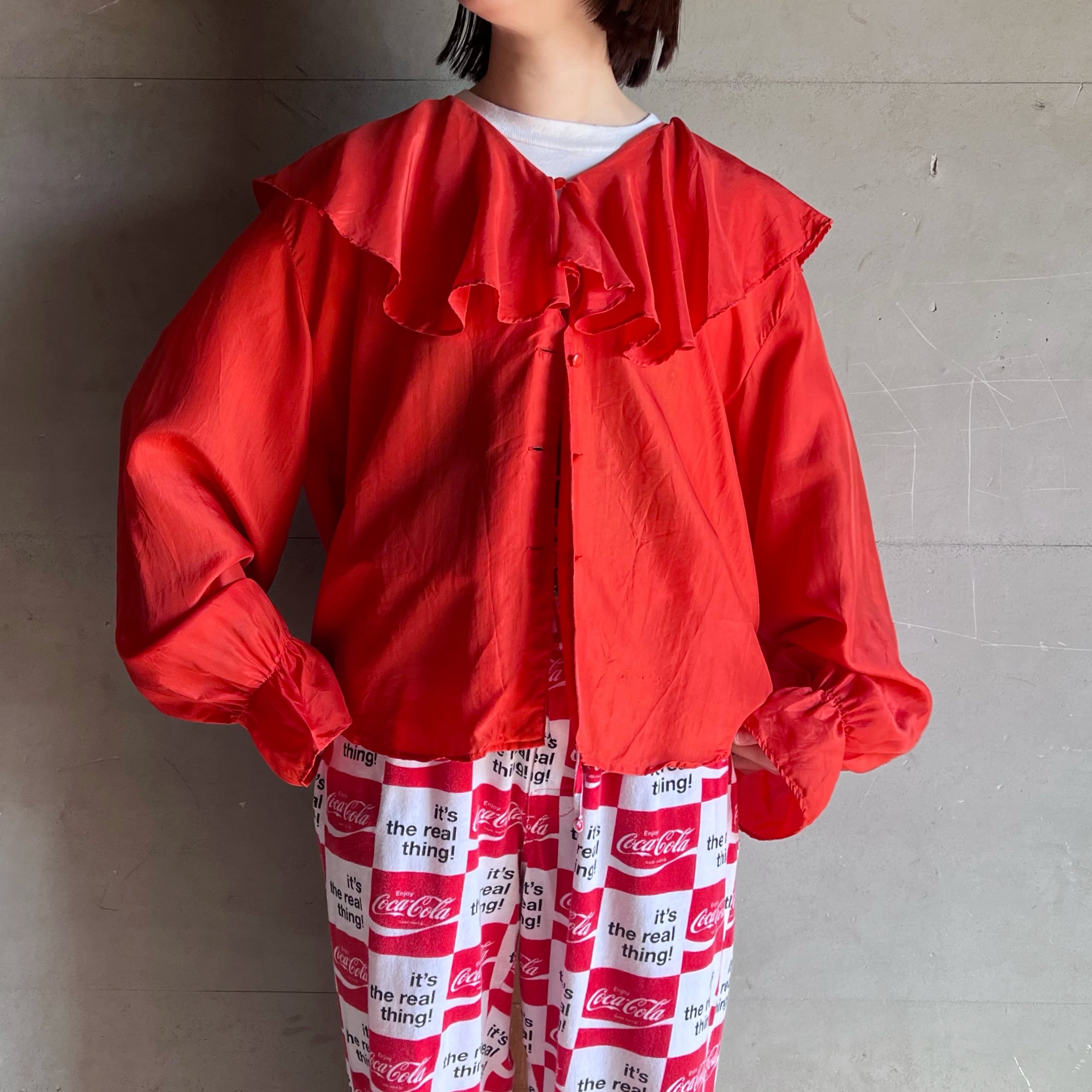 軽くしっとりとしたシルクの手触りと襟と袖口のフリルの組み合わせがたまらないです。