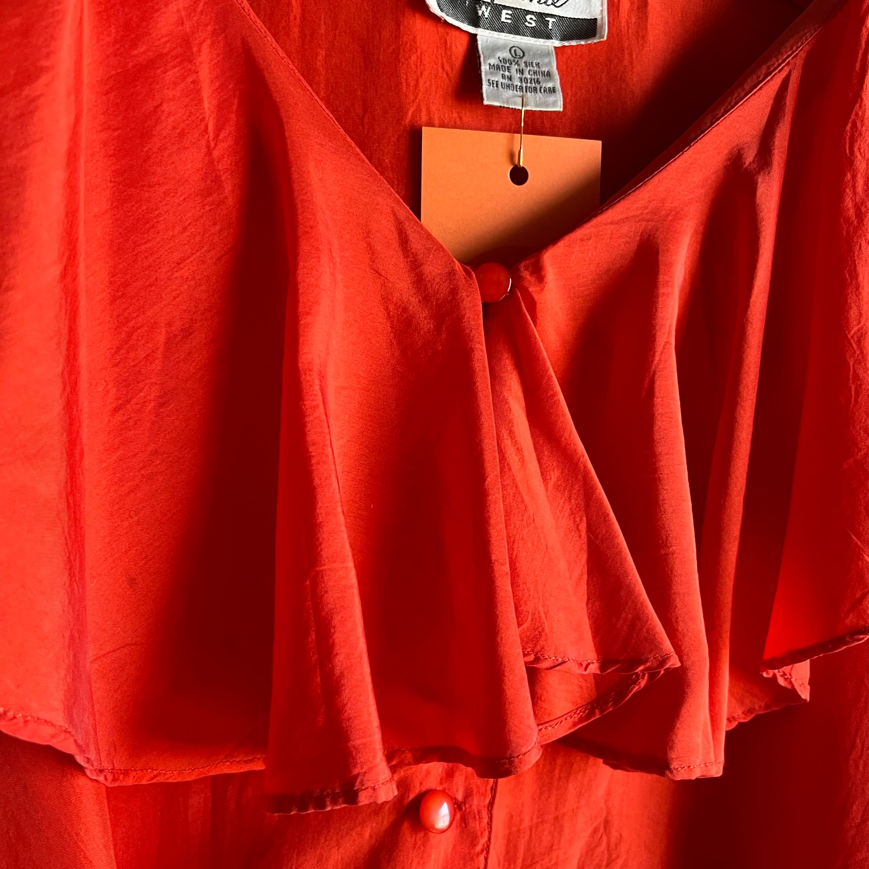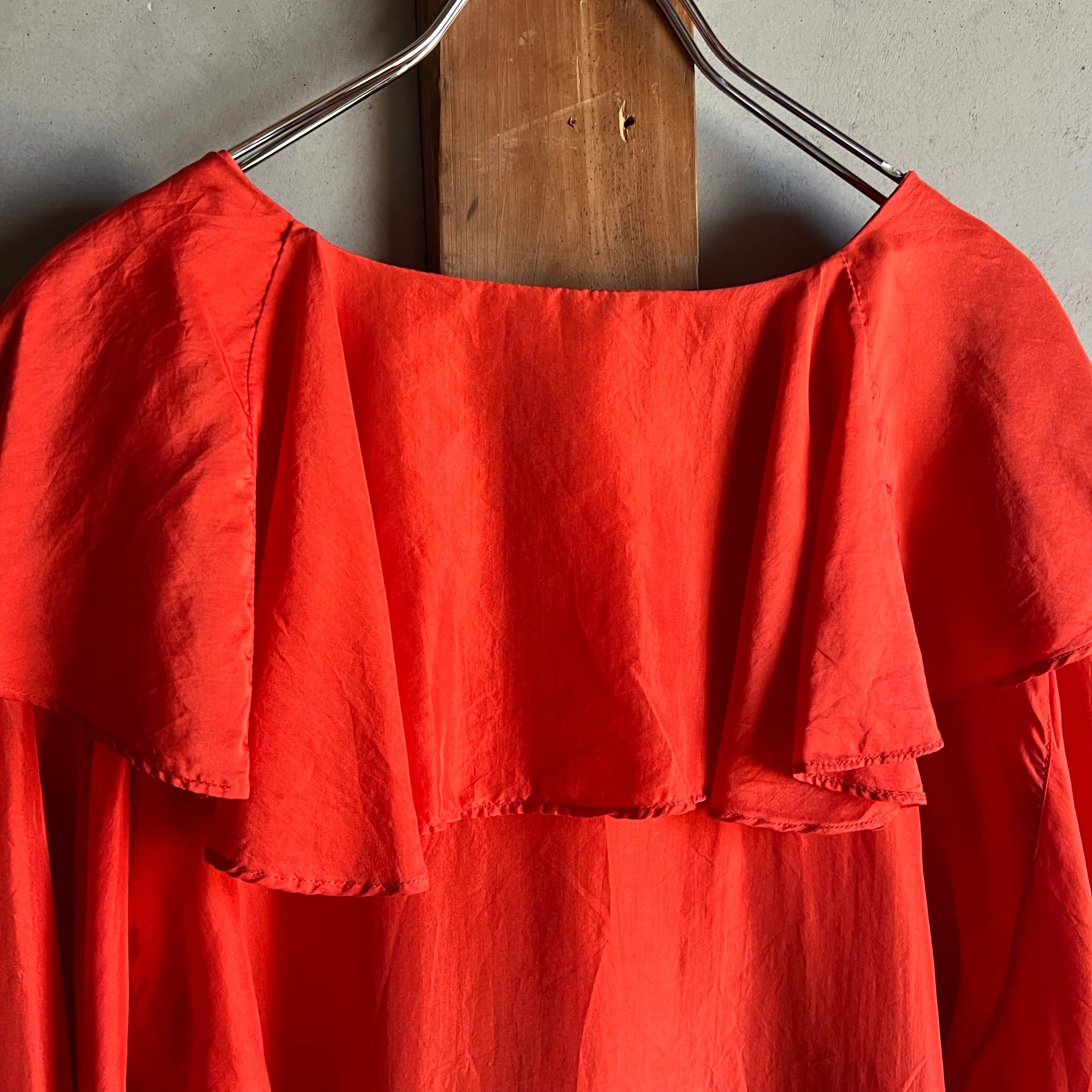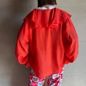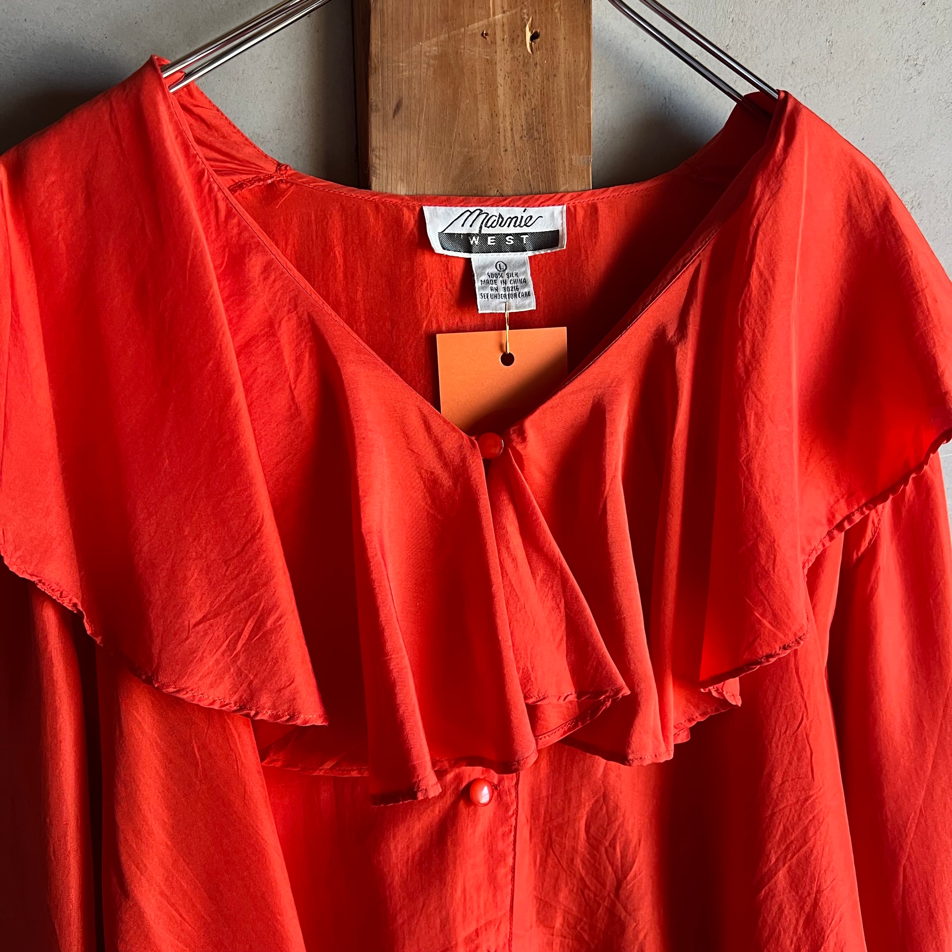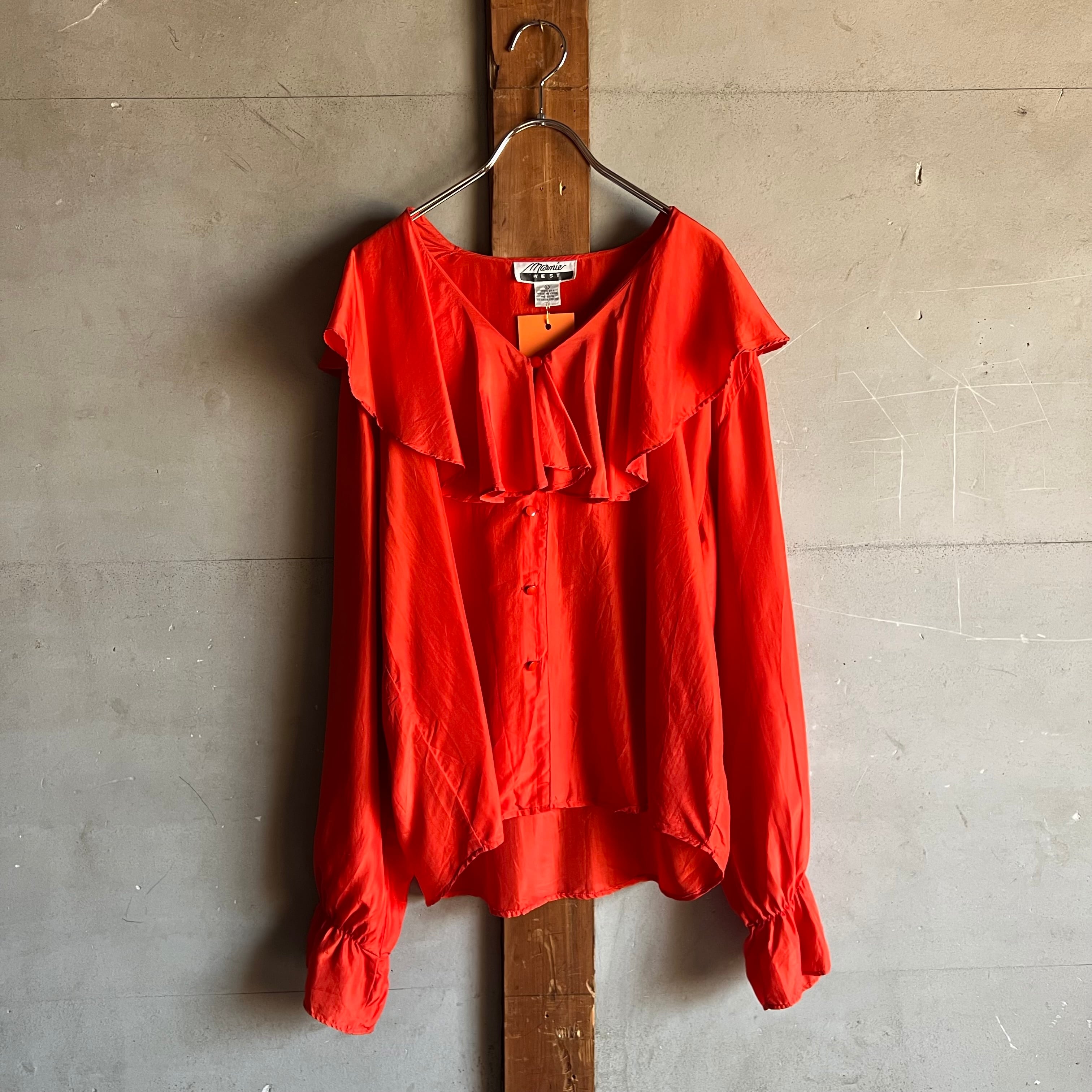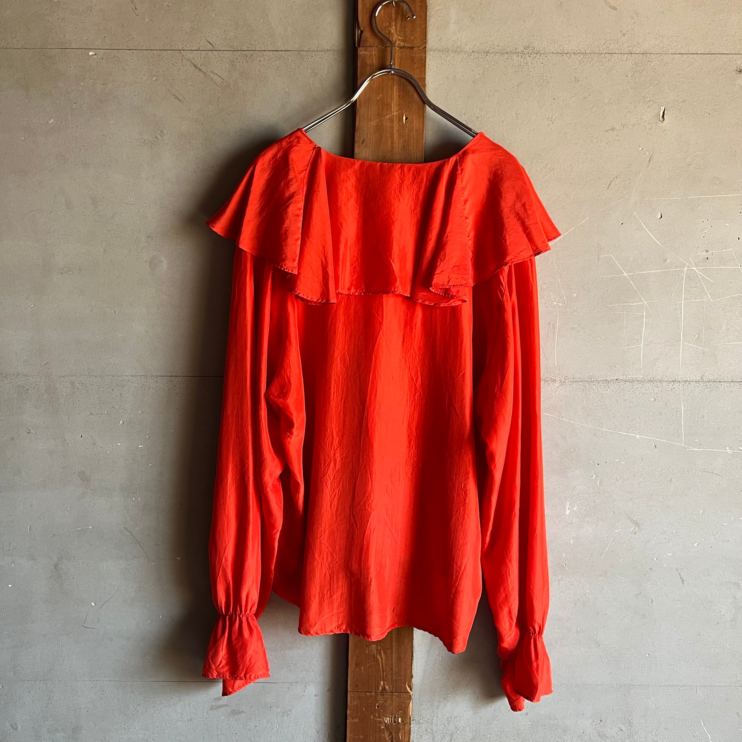 シルクのフリル襟ブラウス。