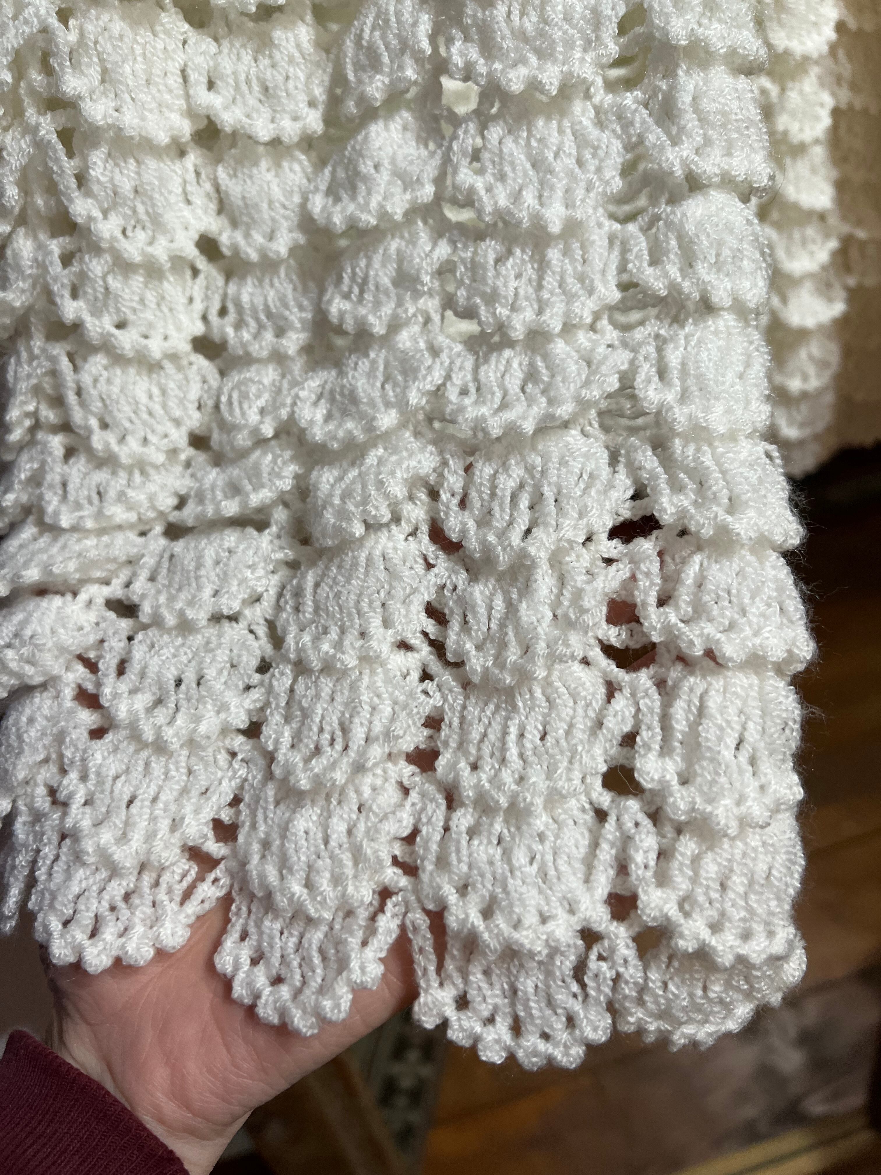 鱗のように編まれたユニークなホワイトカラーのカーディガン。
