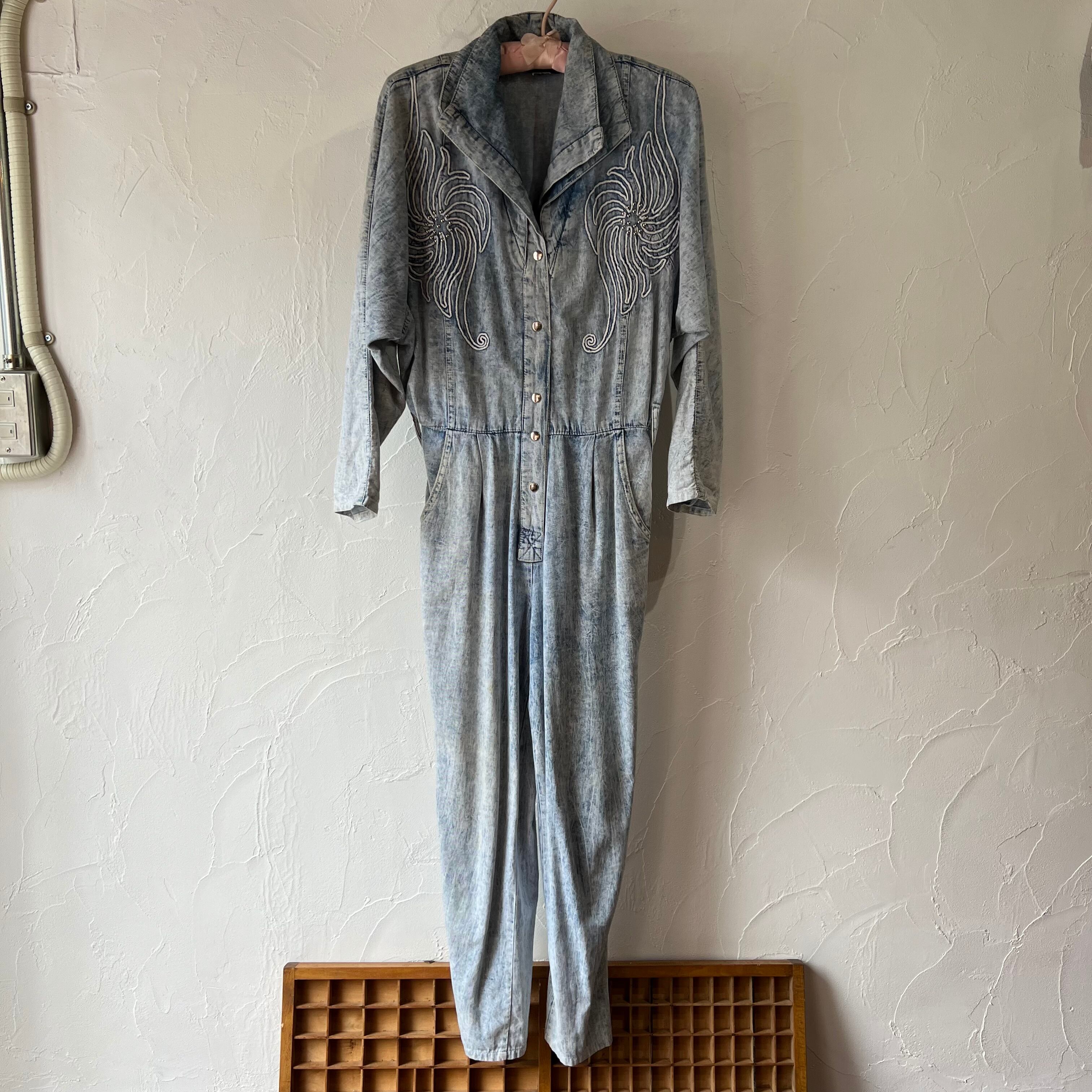 ケミカルウォッシュのデニムのジャンプスーツです。