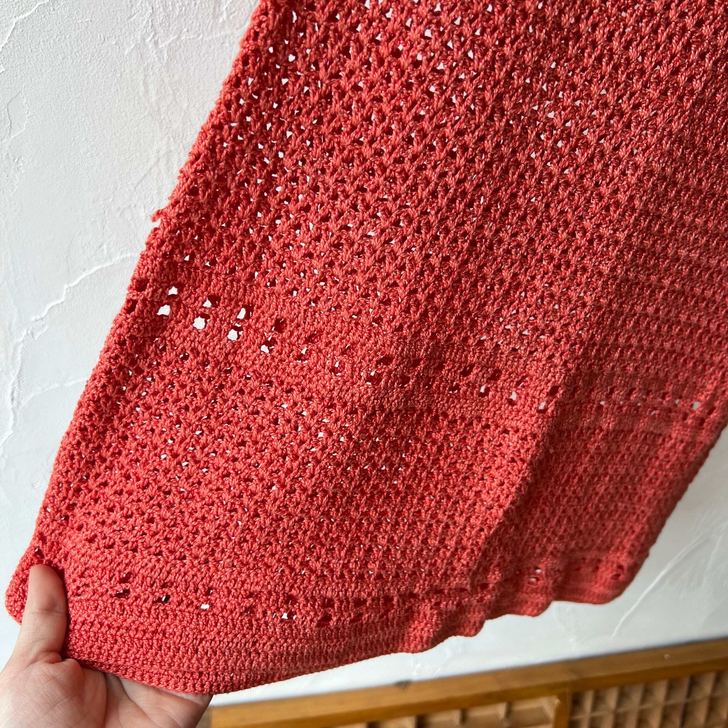 ピンクとオレンジの間くらいのカラーが可愛いクロシェドレス。