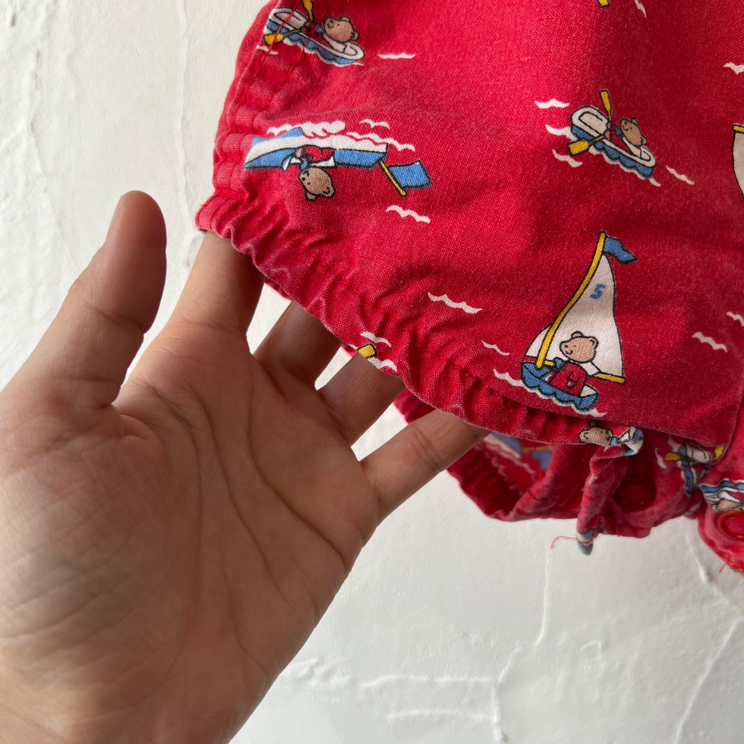 可愛いくまちゃんがマリンレジャーを楽しむ柄のオーバーオール。