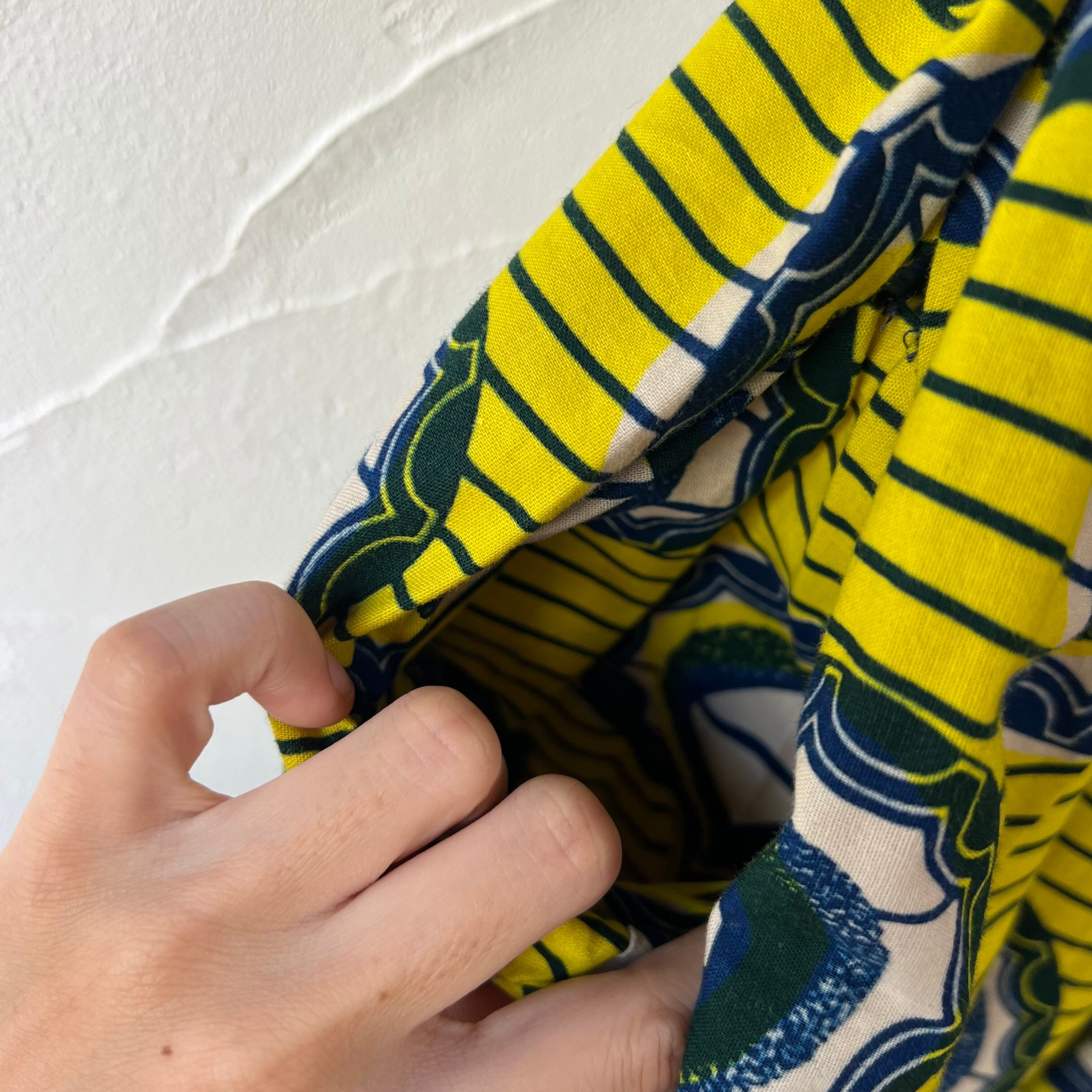 ネイビーのプリントとパイピング刺繍がとても可愛いです。